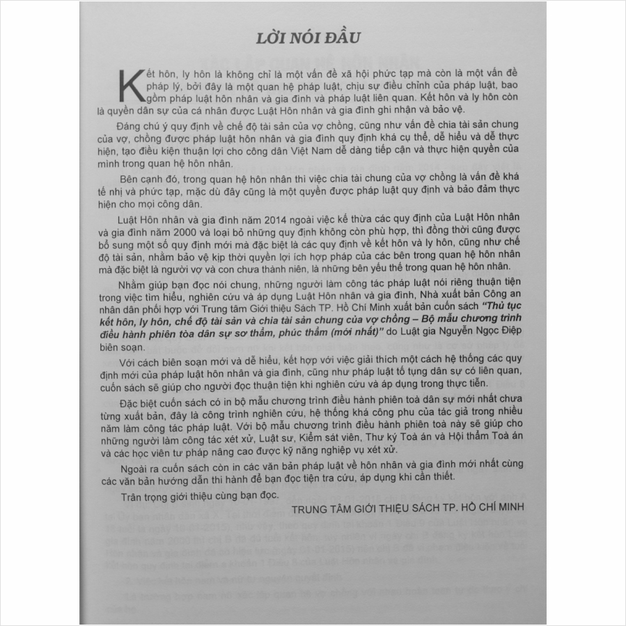 - Phần phụ lục: Tìm hiểu Luật Hôn nhân và Gia đình và các văn bản hướng dẫn liên quan (Luật Nuôi con nuôi, Luật Hộ tịch, Luật Hôn nhân qua các thời kỳ, Bộ mẫu chương trình điều hành phiên tòa dân sự sơ thẩm và phúc thẩm) ...//... Cảm ơn các bạn đã ghé thăm shop Nhà sách Nam Việt rất nhiều ạ! Sách Thủ Tục Kết Hôn, Ly Hôn, Chế Độ Tài Sản và Chia Tài Sản Chung Của Vợ Chồng - Bộ Mẫu Chương Trình Điều Hành Phiên Tòa Dân Sự Sơ Thẩm, Phúc Thẩm (Mới Nhất) Sách Thủ Tục Kết Hôn, Ly Hôn, Chế Độ Tài Sản và Chia Tài Sản Chung Của Vợ Chồng - Bộ Mẫu Chương Trình Điều Hành Phiên Tòa Dân Sự Sơ Thẩm, Phúc Thẩm (Mới Nhất)