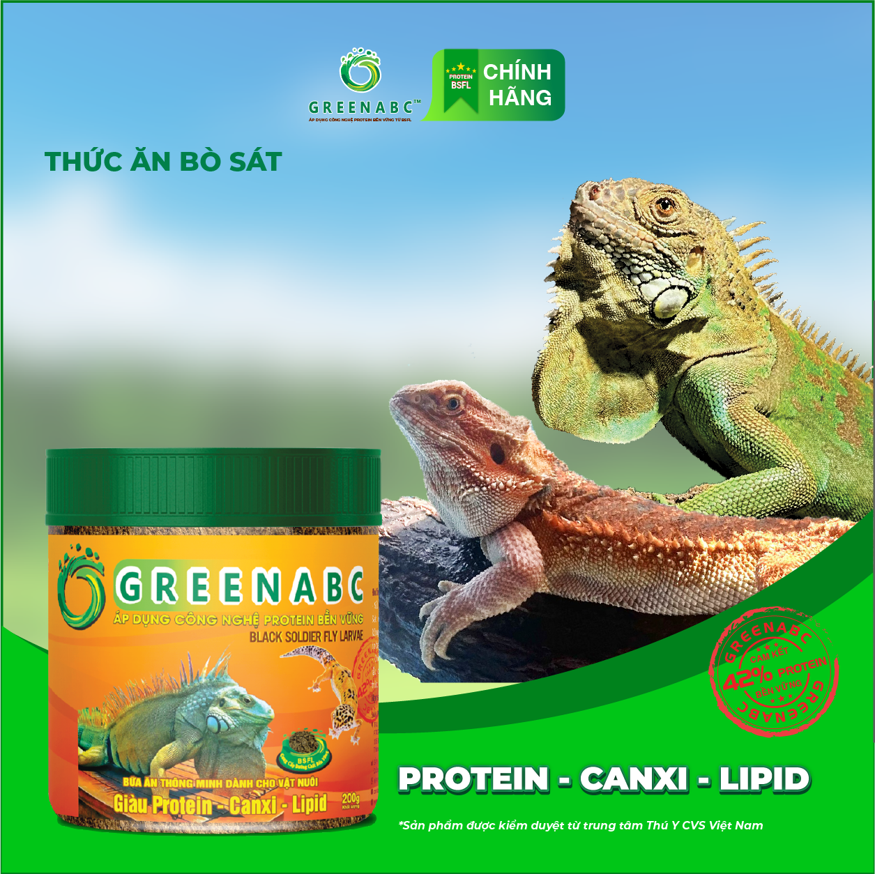 GREENABC là thức ăn cao cấp dành cho các loại bò sát: IGUANA, BEARDED DRAGON, LEOPARD GECKO. Đặc biệt sản phẩm GREENABC được sản xuất theo phương pháp Áp dụng công nghệ PROTEIN BỀN VỮNG từ bột đạm G.Meal rất giàu PROTEIN–CANXI–LIPID có trong BSFL*, đã được Mỹ (AAFCO) và EU chấp nhận đưa vào công thức cho ngành sản xuất thức ăn dành cho thú cưng.