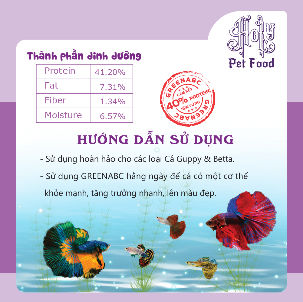 Sản phẩm GREENABC cung cấp các giá trị dinh dưỡng bền vững cho thú cưng, giúp cho Cá Guppy & Betta: