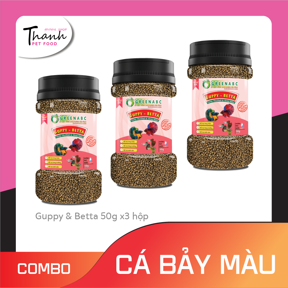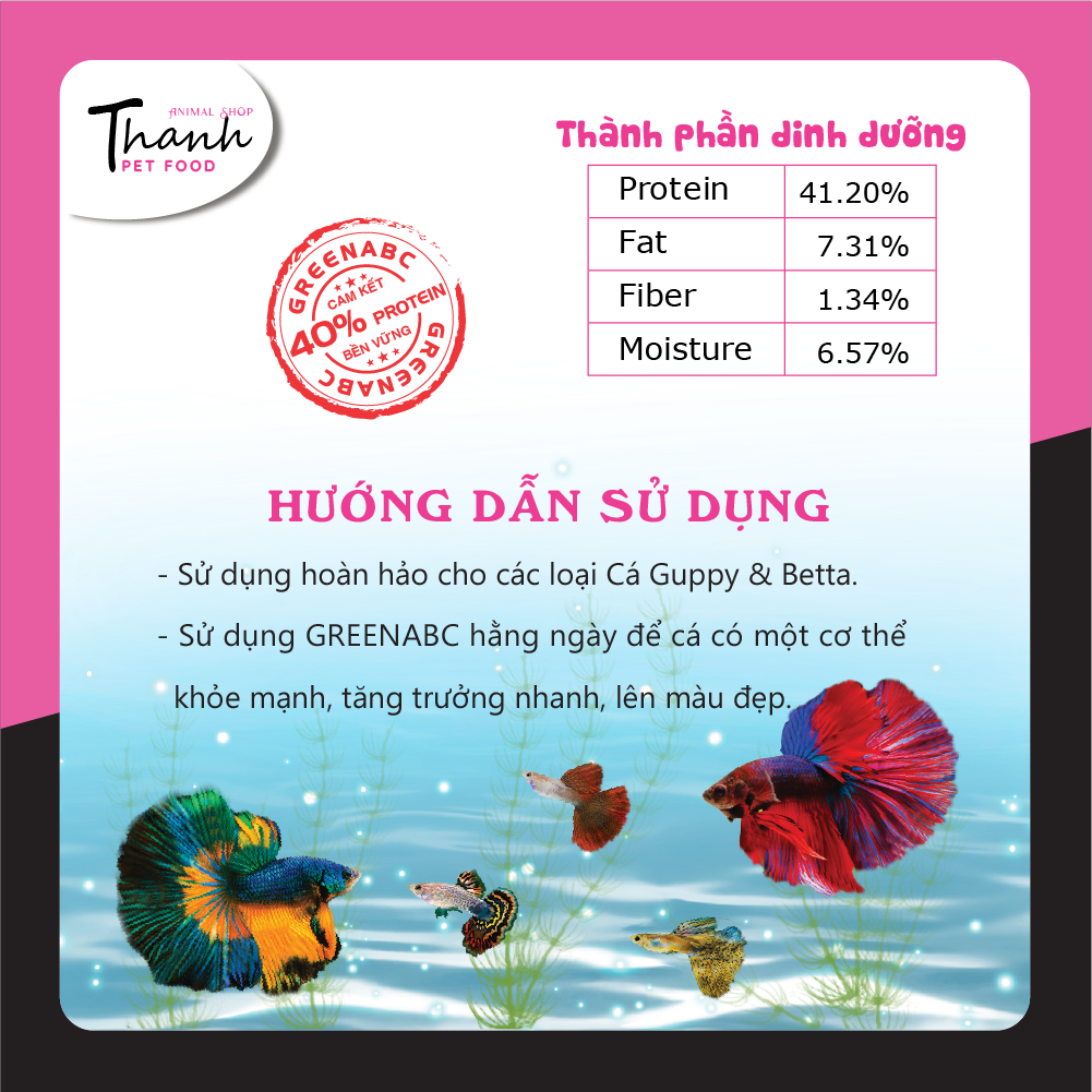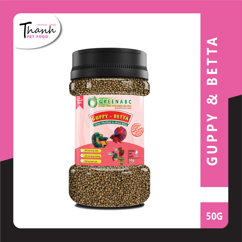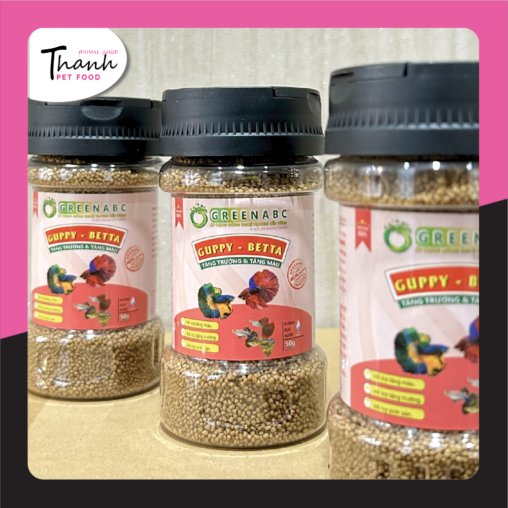 Sản phẩm GREENABC cung cấp các giá trị dinh dưỡng bền vững cho thú cưng, giúp cho Cá Guppy & Betta:       + Vảy sáng dáng đẹp, màu sắc rực rỡ tươi sáng.       + Tiêu hóa tốt, giúp cá hấp thụ các dưỡng chất cần thiết cho cơ thể phát triển toàn diện.       + Tăng sức đề kháng, giúp Cá chống lại các bệnh nấm thường gặp.       + Với hàm lượng PROTEIN > 40% giúp cá có năng lượng dồi dào, khỏe mạnh, linh hoạt.       + Không đục nước, không gây ô nhiễm nguồn nước