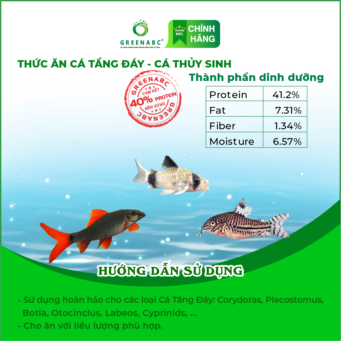 GREENABC là thức ăn cao cấp dành cho các loại CÁ TẦNG ĐÁY. Đặc biệt sản phẩm GREENABC được sản xuất theo phương pháp Áp dụng công nghệ PROTEIN bền vững từ bột đạm G.Meal rất giàu PROTEIN – CANXI – LIPID có trong BSFL*, đã được Mỹ (AAFCO) và EU chấp nhận đưa vào công thức cho ngành sản xuất thức ăn dành cho vật nuôi.
