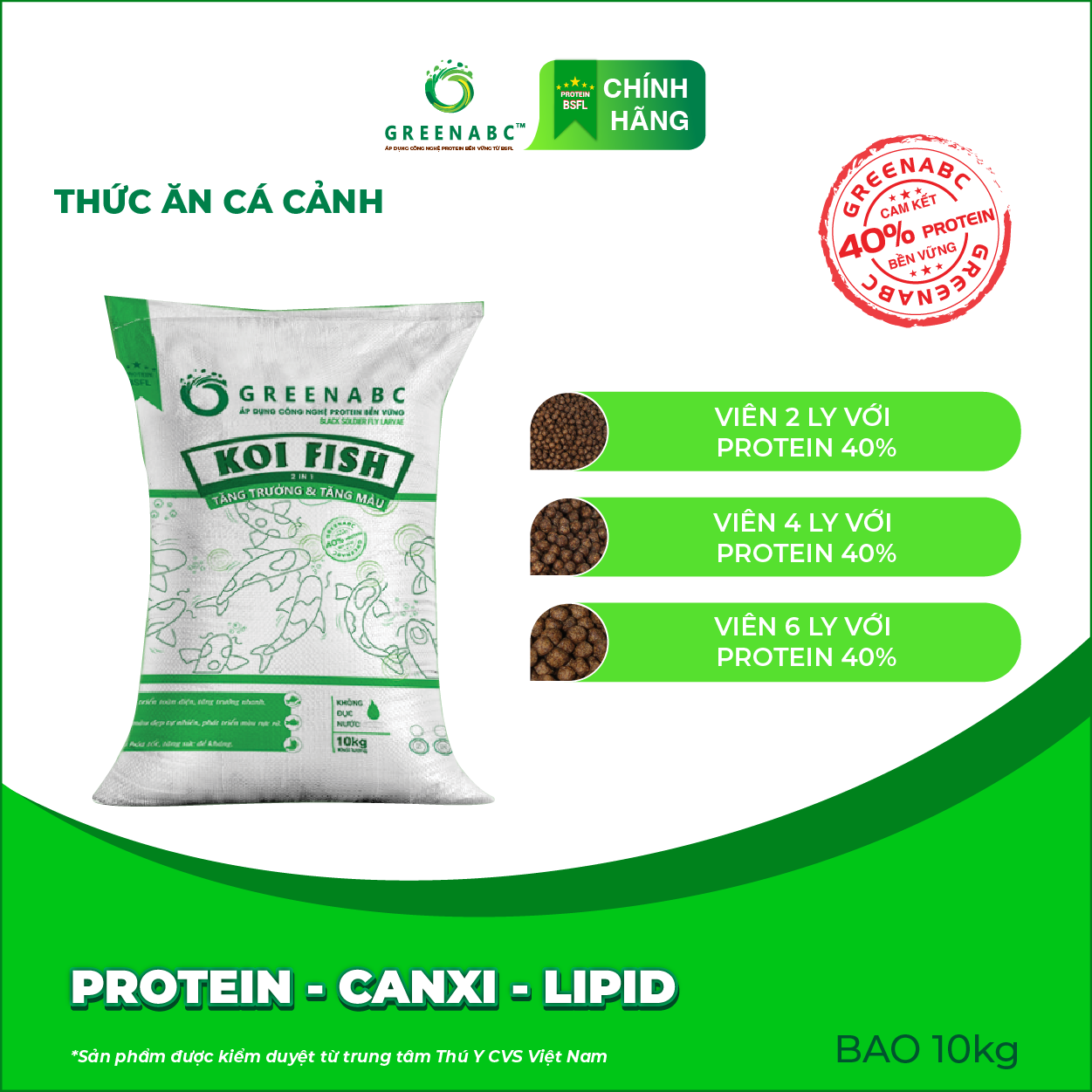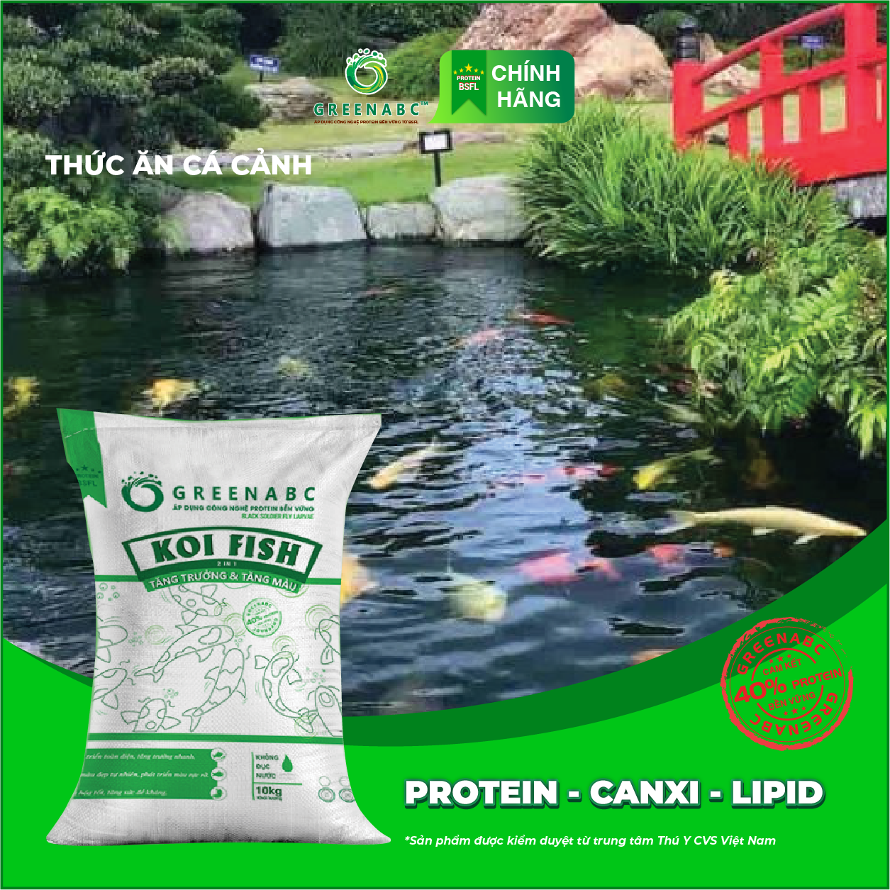 GREENABC là thức ăn cao cấp dành cho CÁ KOI. Đặc biệt sản phẩm GREENABC được sản xuất theo phương pháp Áp dụng công nghệ PROTEIN bền vững từ bột đạm G.Meal rất giàu PROTEIN – CANXI – LIPID có trong BSFL, đã được Mỹ (AAFCO) và EU chấp nhận đưa vào công thức cho ngành sản xuất thức ăn cho vật nuôi.