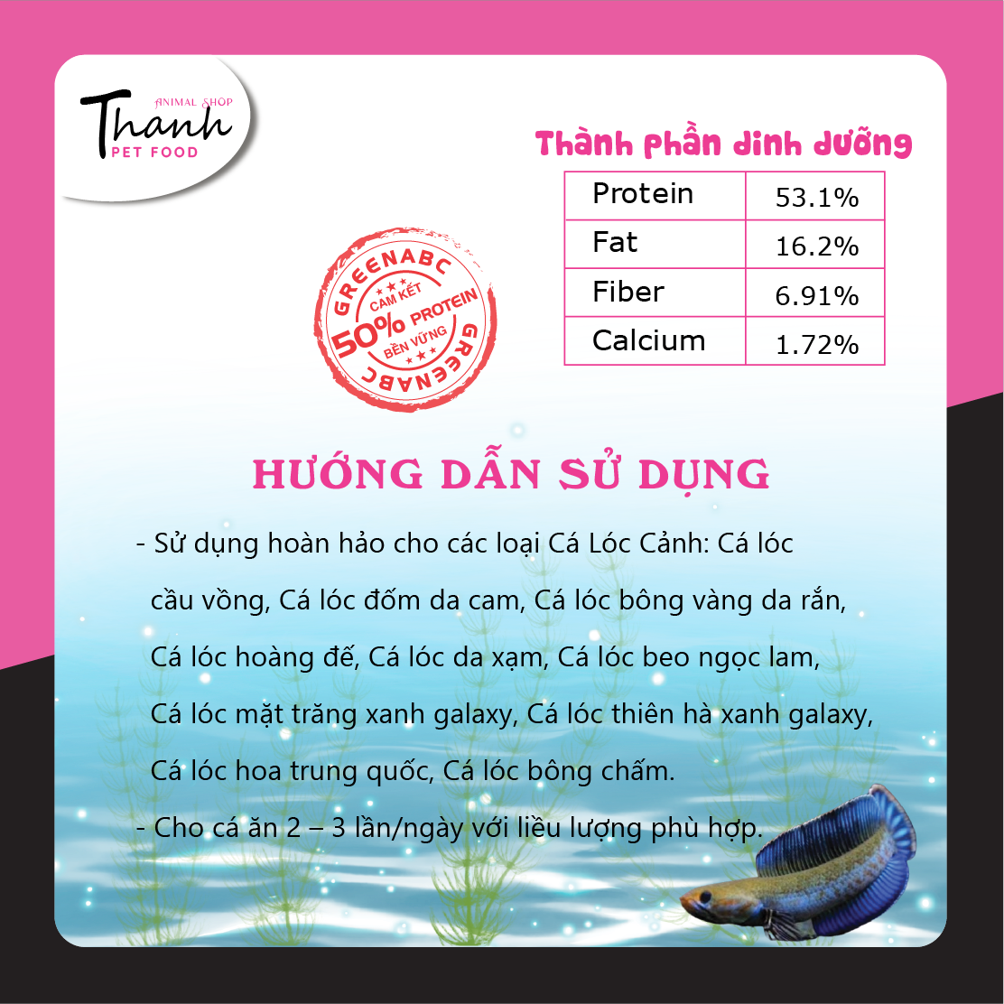Sản phẩm GREENABC cung cấp các giá trị dinh dưỡng bền vững cho vật nuôi, giúp cho CÁ LÓC CẢNH: