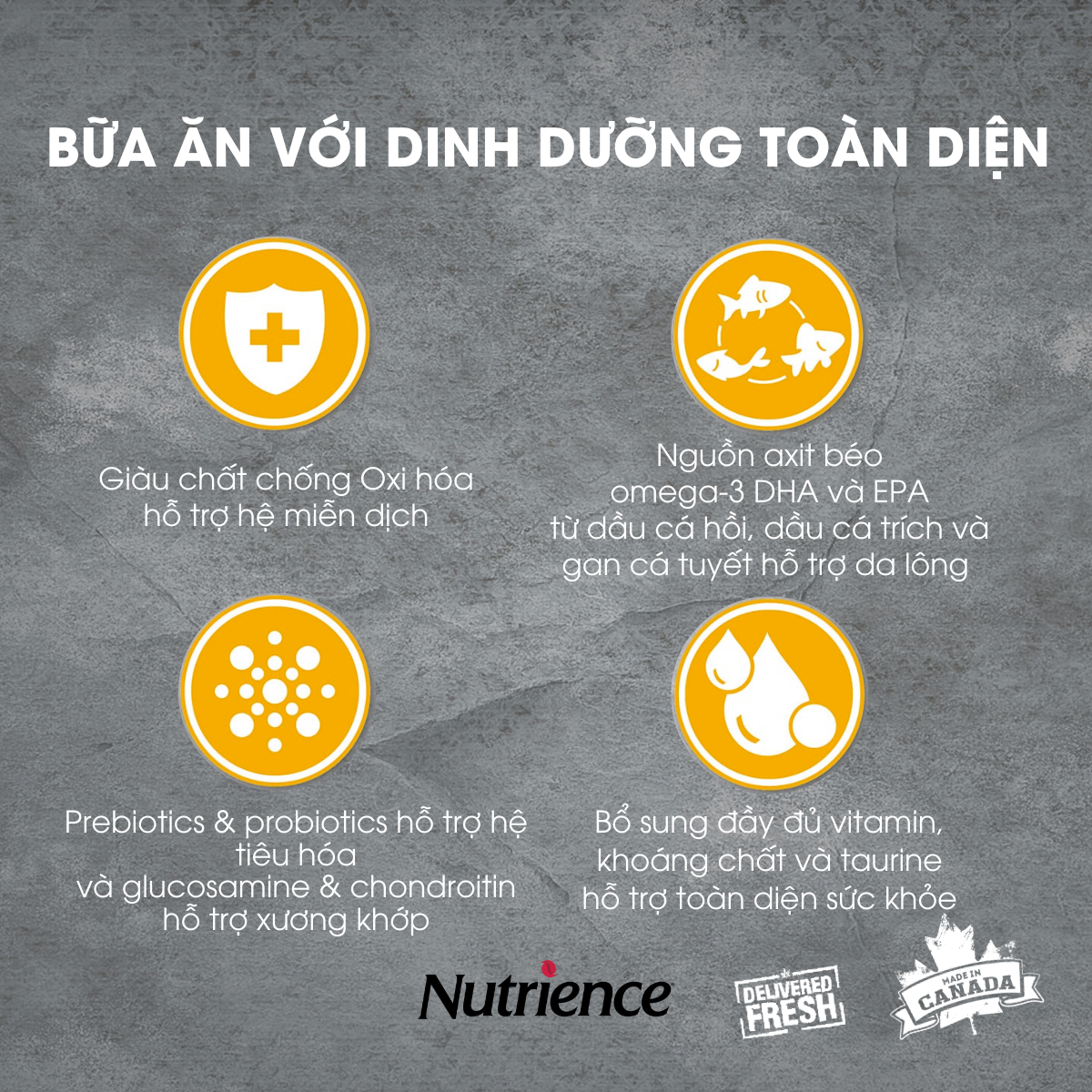 Chất béo kích thích ăn uống ngon miệng, cung cấp axit béo cần thiết Bổ sung Vitamin E và Selen giúp tăng cường hệ thống miễn dịch tự nhiên Vitamin giúp chống lão hóa, cân