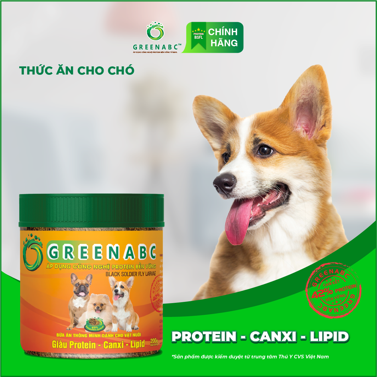 GREENABC là thức ăn cao cấp dành cho các loại chó. Đặc biệt sản phẩm GREENABC được sản xuất theo phương pháp Áp dụng công nghệ PROTEIN BỀN VỮNG từ bột đạm G.Meal rất giàu PROTEIN–CANXI–LIPID có trong BSFL*, đã được Mỹ (AAFCO) và EU chấp nhận đưa vào công thức cho ngành sản xuất thức ăn dành cho thú cưng.
