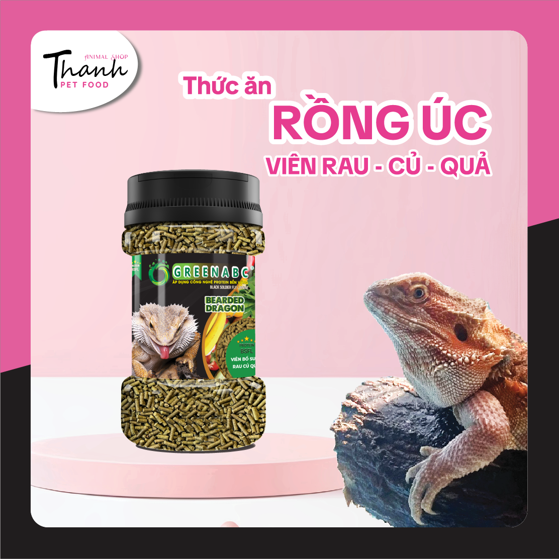 THỨC ĂN RỒNG ÚC, RỒNG RÂU - BỔ SUNG DINH DƯỠNG PROTEIN, CANXI, LIPID GREENABC là thức ăn cao cấp dành cho các loại Rồng Úc, Rồng Râu. Đặc biệt sản phẩm GREENABC được sản