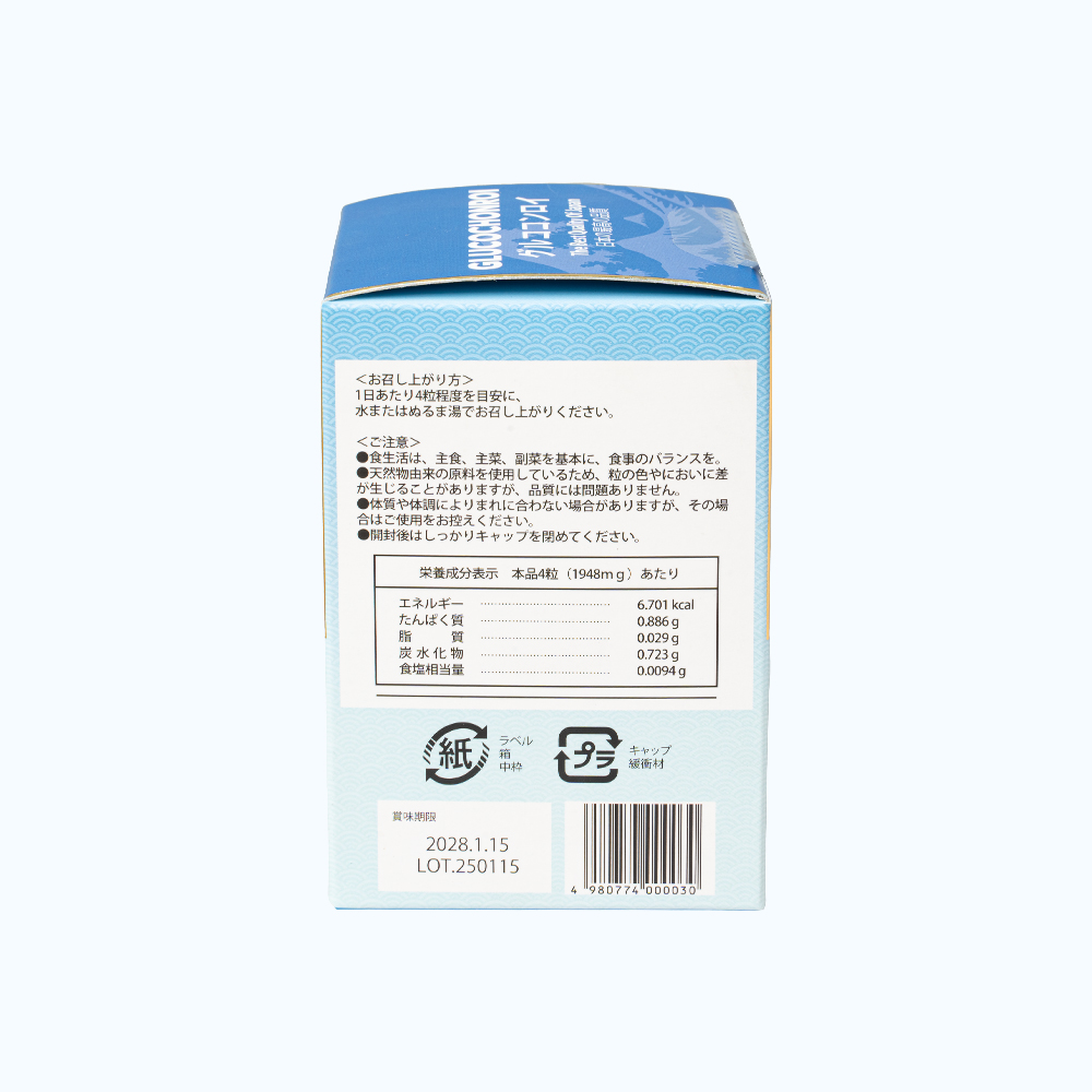 - Thành phần đầy đủ trong mỗi viên nang cứng Glucosamine Hydrochloride (Glucosamine thực tế: 285mg/ 1 viên): 300mg; Canxi (Canxi từ vỏ sò): 50mg; Collagen thủy phân từ da cá: 25mg; Choindroitin (Chondroitin sulfate): 15mg; Axit Hyaluronic: 1mg; Vitamin B1 (Thiamine Hydrochloride): 1mg; Bột chiết xuất rễ Hà thủ ô Nhật Bản (Fallopia multiflora) (tỷ lệ chiết xuất 5:1): 0.5mg; Methylsulfonylmethane (MSM): 0.5mg; Adenosyl-L-methionine (men chứa SAMe, men Sake): 0.1mg; Elastin (từ bột chiết xuất cá ngừ) (tỷ lệ chiết xuất 1:1): 0.1mg; Proteoglycan (từ bột chiết xuất sụn cá hồi) (tỷ lệ chiết xuất 1:1): 0.1mg Phụ liệu: Chất ổn định (Canxi stearat, Silic dioxit, tinh bột), chất làm đặc (Cellulose vi tinh thể), chất tạo màu tự nhiên (màu caramen) và vỏ nang (Gelatin) Công dụng Hỗ trợ tăng cường chất nhờn bôi trơn ổ khớp; Hỗ trợ cải thiện khả năng vận động linh hoạt của khớp; Hỗ trợ cải thiện tình trạng đau, khó vận động của khớp