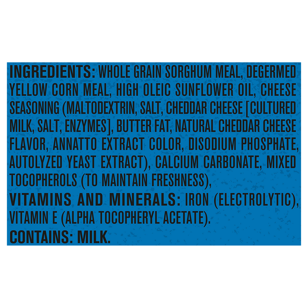 - Bột Lúa Mạch Nguyên Hạt, Bột Ngô Vàng Đã Phát Mầm, Dầu Hướng Dẫn Hào Có Hàm Lượng Oleic Giàu, Gia Vị Phô Mai (Maltodextrin, Muối, Phô Mai Cheddar [Sữa Nuôi, Muối, Enzym], Bơ Bơ, Hương Phô Mai Cheddar Tự Nhiên, Màu Chiết Xuất Annatto, Disodium Phosphate, Chiết Xuất Nấm Men Tự Phân), Canxi Carbonat, Tocopherol Hỗn Hợp (Để Duy Trì Độ Tươi),