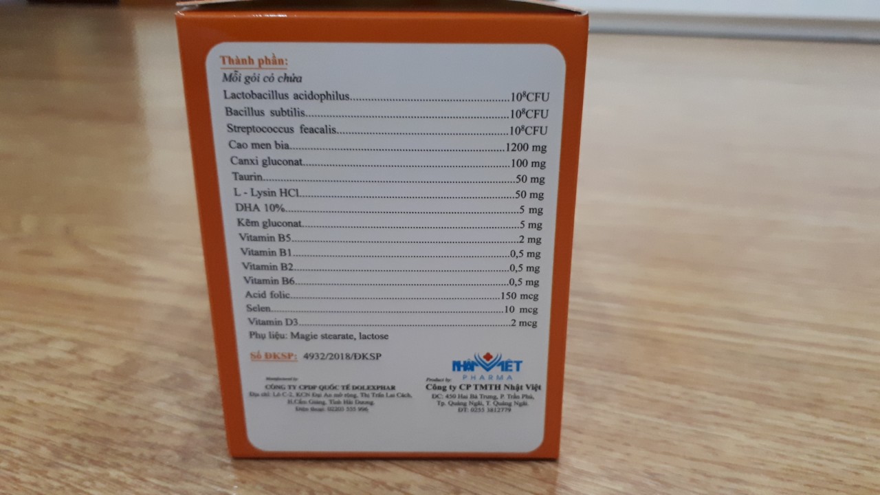 Mua tại TiktokQuy Cách Đóng Gói: Hộp 30 gói x 3g Thành Phần: Mỗi gói 3g chứa Lactobacillus acidophilus 108 CFU Taurin 50 mg Bacillus subtilis 108 CFU L - Lysin HCL 50 mg Streptococcus feacalis 108 CFU Vitamin B1 0.5 mg Cao men bia 1200 mg Vitamin B2 0.5 mg Canxi Gluconat 100 mg Vitamin B6 0.5 mg DHA 10% 1000 mcg Vitamin B5 2 mg Kẽm Gluconat 5 mg Vitamin D3 2 mcg Acid folic 150 mcg Phụ liệu lactose, magie stearat vừa đủ 3g Selen 10 mcg Công dụng :