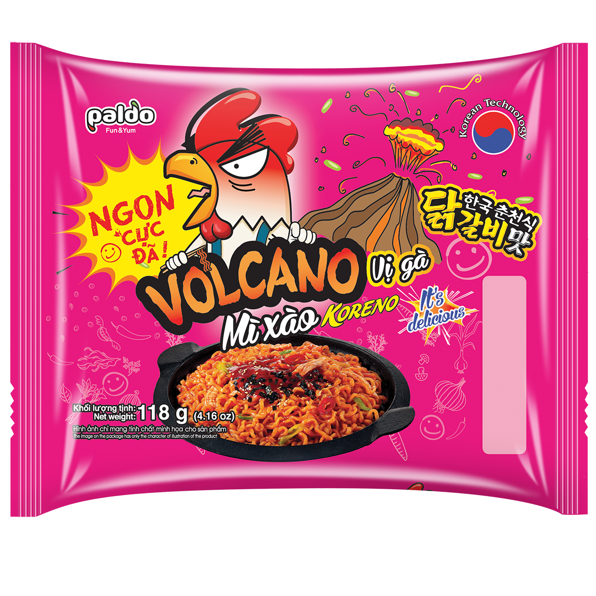 - Mỳ Xào Vị Gà Koreno Volcano với hương vị cay nồng đặc trưng cùng vợi hương vị phomai béo ngậy, hấp dẫn, giúp người thưởng thức có một trải nghiệm tuyệt vời. - Mỳ