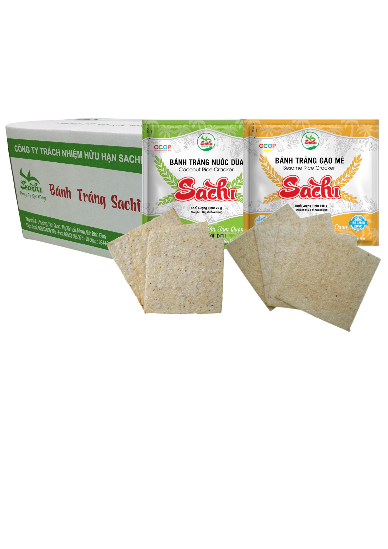 Bánh tráng gạo mè và bánh tráng nước dừa nướng sẵn Sachi xốp, giòn rụm, được sản xuất trên dây chuyền hiện đại khép kín, bánh nướng bằng điện vàng đều 2 mặt, bao bì