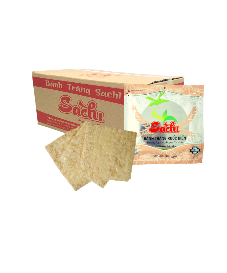 Bánh tráng gạo mỏng Sachi là món ăn không thể thiếu của người dân Bình Định, trong các dịp lễ cũng như các bửa ăn ngày thường. Thành phần: Gạo 93%, tinh bột mì, muối.