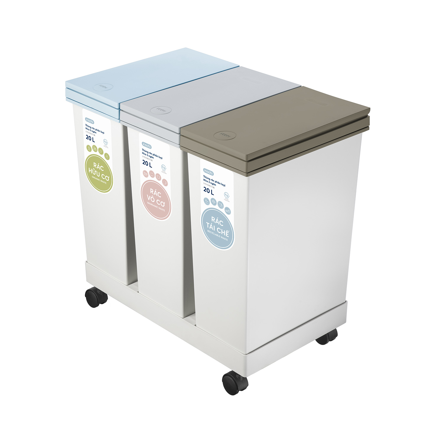 Mua tại TiktokThùng rác phân loại Hiro 3 ngăn Mã SP: HIN.RAPL.003N Kích thước: 537x336x530 mm Khối lượng: 3620 g Chất liệu: Nhựa PP, PA nguyên sinh, hạt màu, phụ gia kháng khuẩn (Ag+), lò xo Màu sắc: Xanh nhạt + Ghi sữa + Nâu Café HƯỚNG DẪN SỬ DỤNG: Dùng để đựng và phân loại rác trong gia đình, văn phòng, nhà hàng,… BẢO QUẢN: nơi khô ráo, thoáng mát. Tránh xa nguồn nhiệt ƯU ĐIỂM: Thiết kế hiện đại, dễ dàng tháo lắp và vệ sinh, bánh xe di động giúp di chuyển dễ dàng
