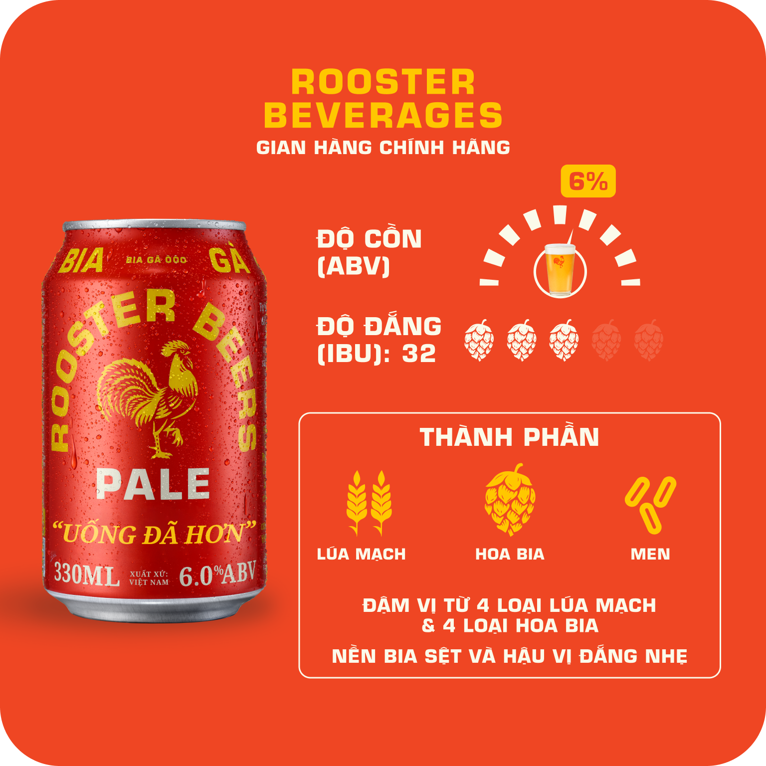 Mua tại TiktokRooster Beer Pale - Vị Nồng Nàn Dễ dành chinh phục cả những người sành bia khó tính Rooster Pale mang đến cho bạn trải nghiệm thưởng bia tinh tế với nền bia sệt quấn quýt nơi đầu lưỡi, hậu vị đắng nhẹ và hương hoa bia nồng nàn. Ghi chú • Bia Pale phong cách Mỹ • Được nấu từ 4 loại lúa mạch và 4 loại hoa bia • Nền bia sệt. Hậu vị đắng nhẹ • 6.0% ABV – 32 IBU • Dùng kèm các món nướng: xúc xích, hải sản và thịt bò. VỀ ROOSTER BEERS: Là những chuyên gia nấu bia đầy đam mê, sáng tạo và nhiệt huyết, chúng tôi mong muốn mang đến cho khách hàng những dòng bia thủ công mang hương vị cổ điển tuyệt hảo. Mỗi ngụm bia Rooster mát lạnh sẽ là một trải nghiệm thuởng thức đáng nhớ, kể cả đối với những người sành bia lâu năm.