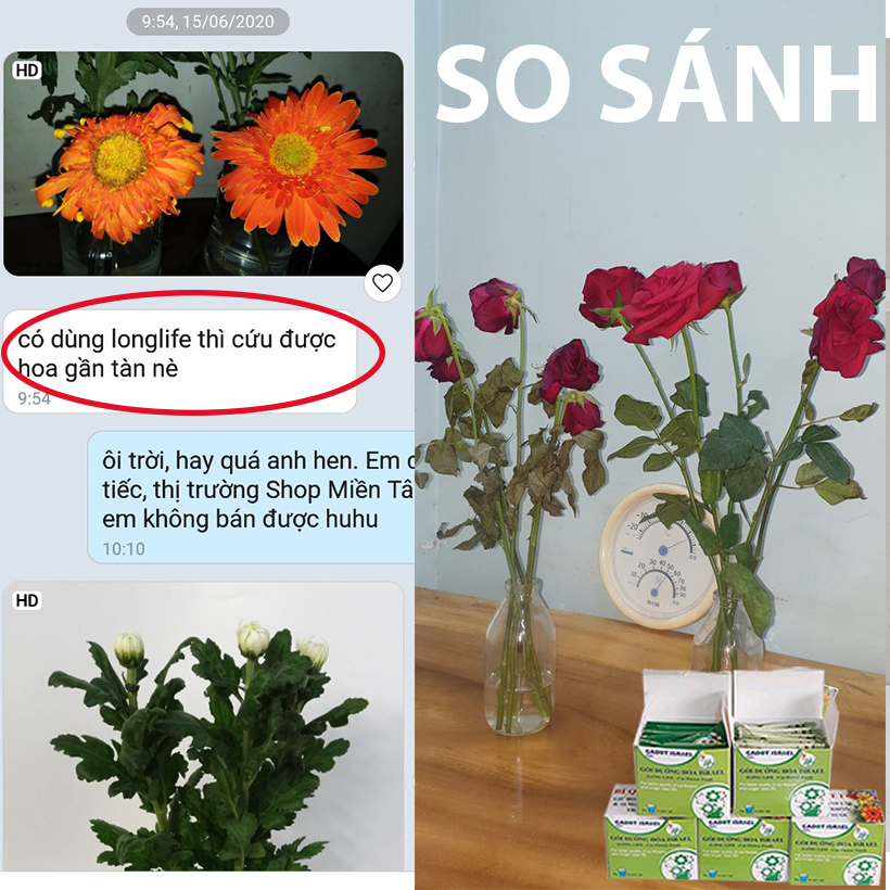 Hoa cắt cành trải qua quá trình dài từ đóng gói, vận chuyển quãng đường xa khiến hoa nhanh héo tàn, lá úa vàng, đầu bông khô và khả năng hút nước bị giảm đi. Vì vậy, cần sử dụng Gói dưỡng hoa tươi lâu LONGLIFE để giữ hoa tươi lâu gấp 2 lần sau khi mua về cắm bình. Thành phần 90% đường cung cấp dưỡng chất cho hoa sau một thời gian dài bị cắt cành. Nhờ đó hoa tươi căng nhanh chóng và giúp hoa đứng thẳng, không còn tình trạng gãy đầu bông.