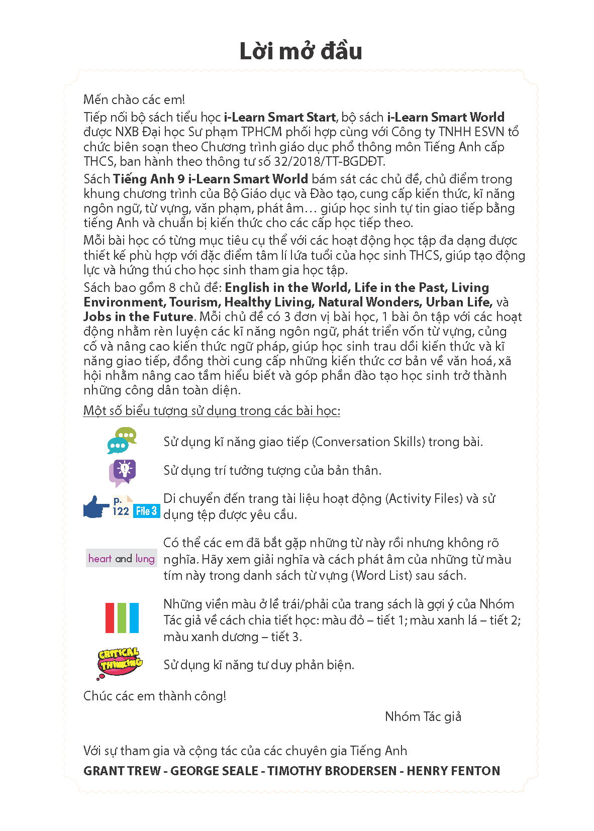 Mua tại TiktokTiếng Anh i-Learn Smart World là khóa học 4 cấp độ tiếng Anh dành cho học sinh THCS. i-Learn Smart World đã được phát triển bởi một đội ngũ giàu kinh nghiệm gồm các nhà văn, giáo viên quốc tế và Việt Nam để trở nên hoàn hảo cho lớp học Việt Nam và bao gồm đầy đủ chương trình giảng dạy quốc gia của Việt Nam và Khung Tham chiếu Ngôn ngữ Chung Châu Âu (CEFR). Tiếng Anh 9 i-Learn Smart World đã được Bộ Giáo dục và Đào tạo thẩm định và phê duyệt.