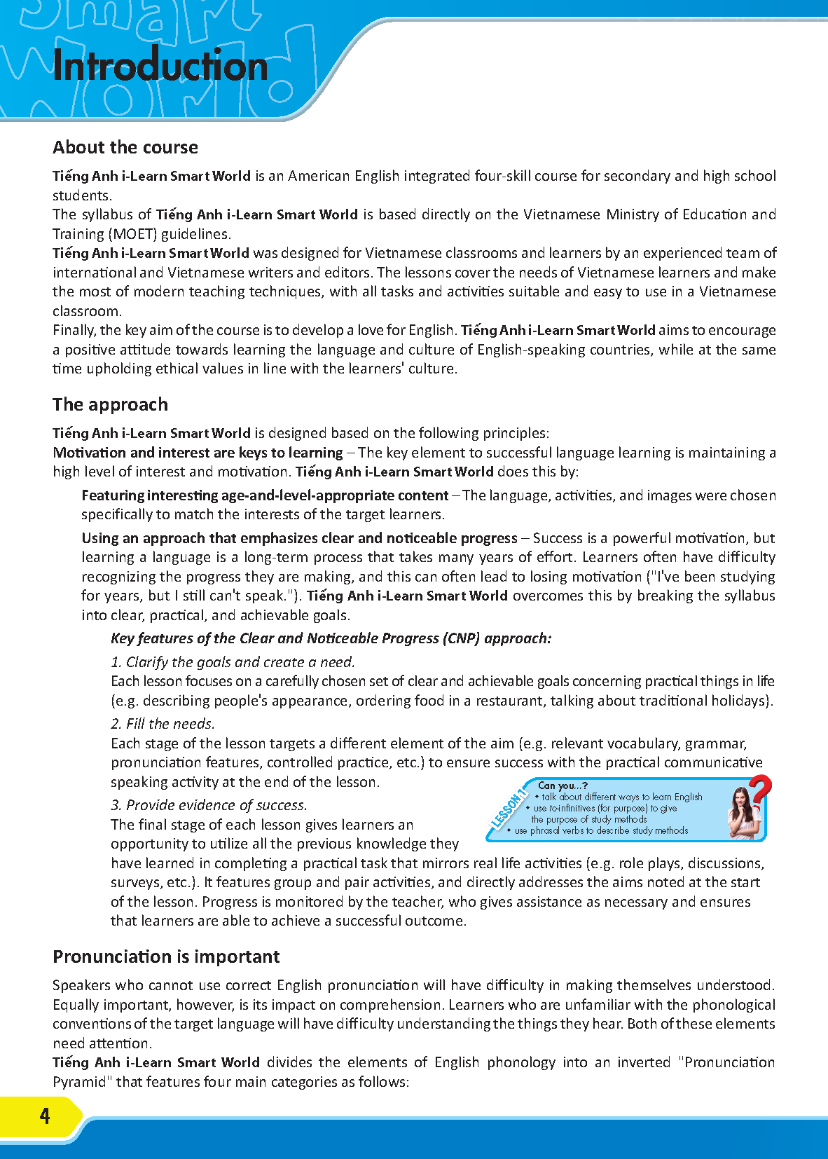 Bộ sách gồm: sách bài học, sách bài tập, vở tập viết. Tiếng anh i-Learn Smart World là khóa học 4 cấp độ tiếng Anh dành cho học sinh THCS. i-Learn Smart World đã được