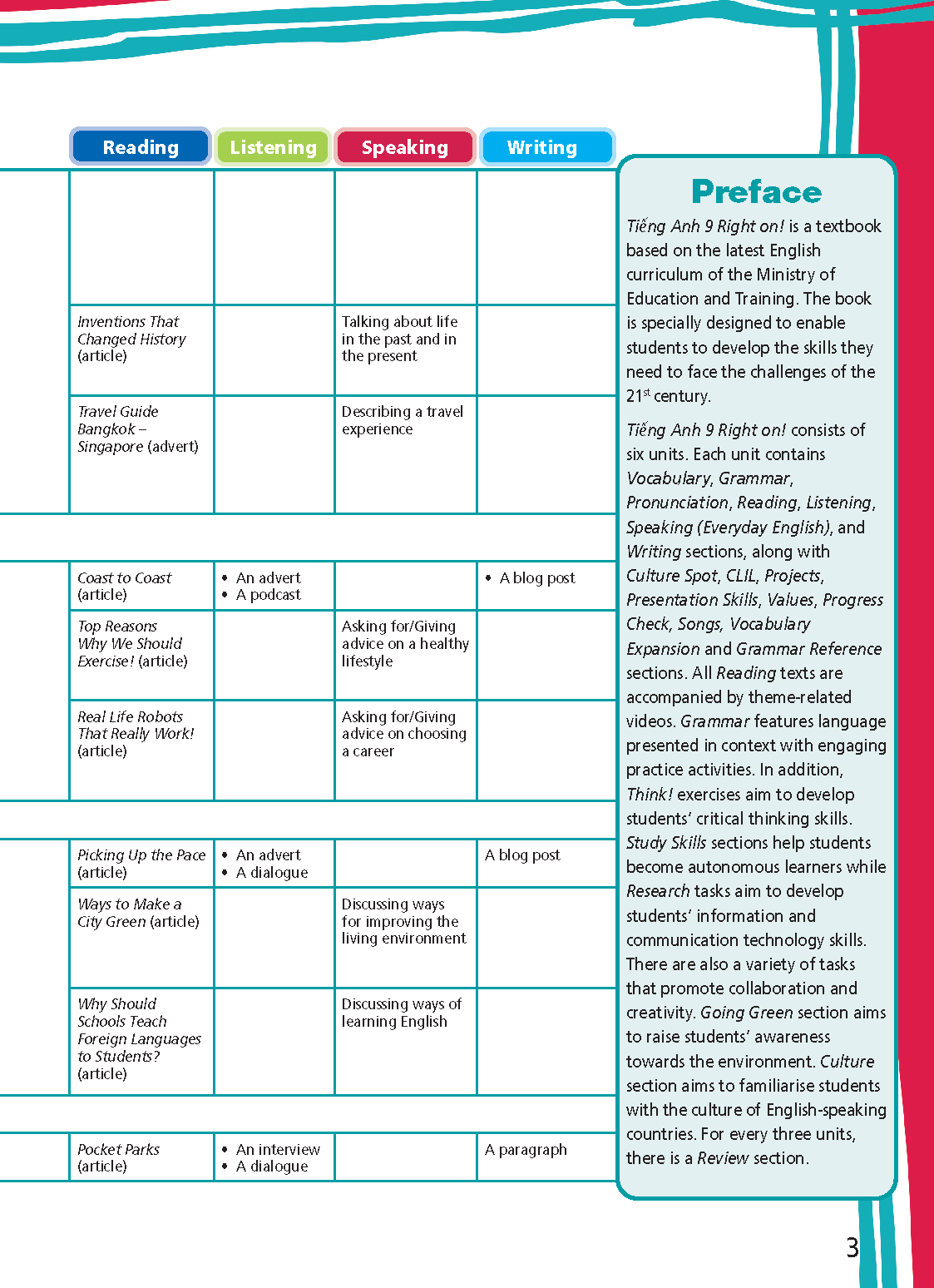 Bộ sách Tăng cường Kĩ năng Đọc, Nghe và Giao tiếp được thiết kế dành cho học sinh Trung học cơ sở và Trung học phổ thông (từ lớp 6 đến lớp 12) Với các