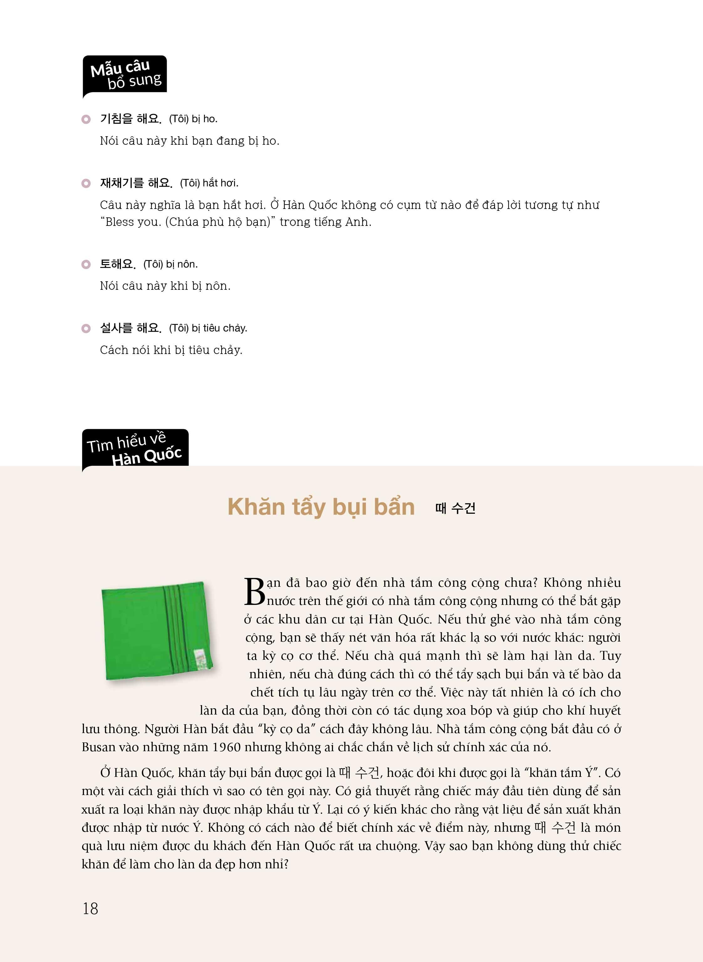 Mỗi bài học được mở đầu bằng phần Đối thoại, nơi bạn tìm thấy các mẩu nói chuyện căn bản trong đời sống thường ngày của người Hàn Quốc, như "Ngày mai gặp nhé", "Bạn ăn trưa chưa" hay "Đừng quá vội" Bên dưới mẩu đối thoại là đề mục "Kiểm tra phát âm", giúp bạn nắm được những điểm thường hay sai khi phát âm. Kế tiếp là các phần Từ & cụm từ, Chủ điểm ngữ pháp, Luyện tập mẫu câu bổ sung và Tìm hiểu về Hàn Quốc, hỗ trợ bạn học và thực hành tiếng Hàn thật toàn diện. Mong rằng bộ sách sẽ giúp bạn thật sự yên tâm và có thêm cảm hứng trong quá trình học tiếng Hàn.