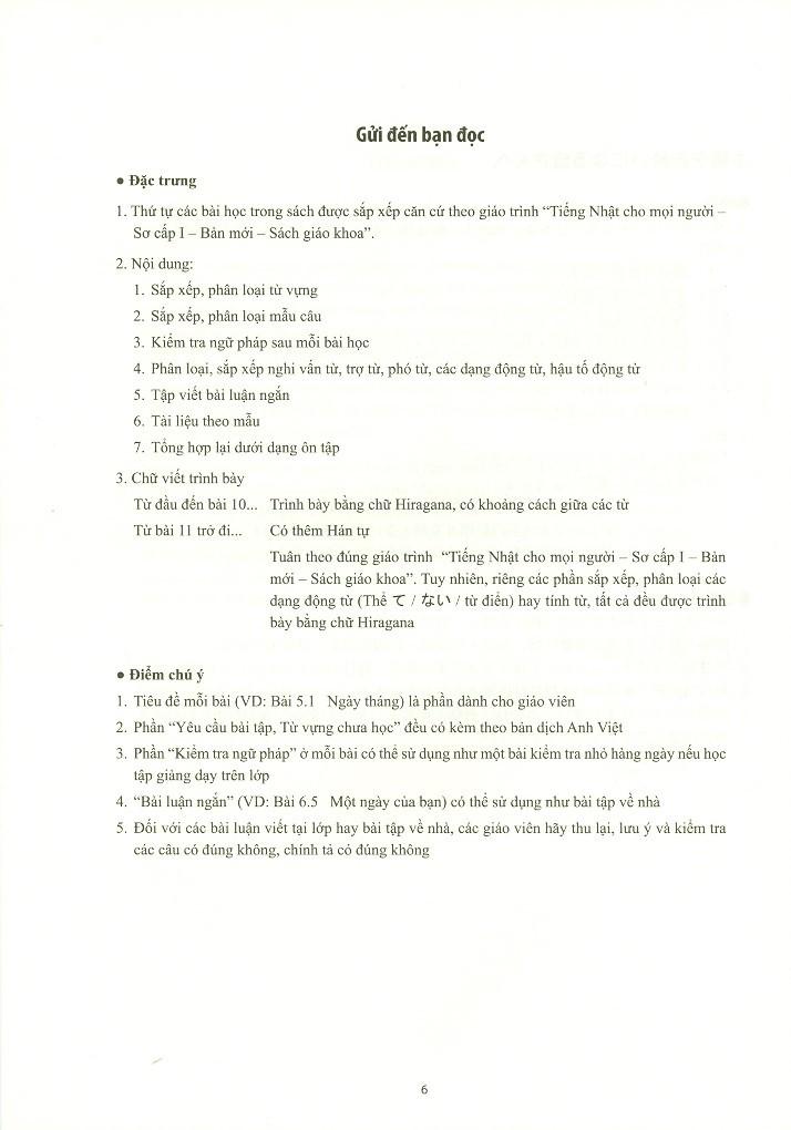 Được thiết kế giúp người học sắp xếp phân loại lại từ vựng, các điểm ngữ pháp trình độ sơ cấp, và ghi nhớ chúng bằng cách viết thành câu. Và khi viết thành câu, dù chỉ là những câu đơn, sẽ thấy ngay nhiều vấn đề, như dùng sai hay thiếu trợ từ, viết sai chính tả, các mẫu câu không chính xá