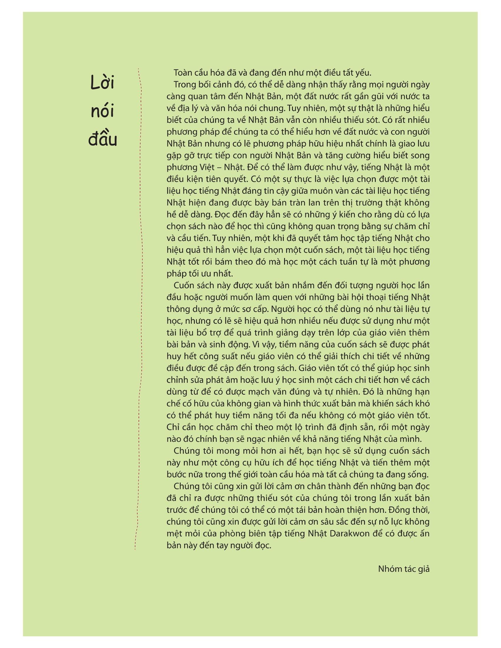 Cuốn sách này được xuất bản nhằm giúp đỡ các bạn trẻ mới bắt đầu học tiếng Nhật, hoặc những người muốn làm quen với những bài hội thoại tiếng Nhật thông dụng ở mức sơ cấp.