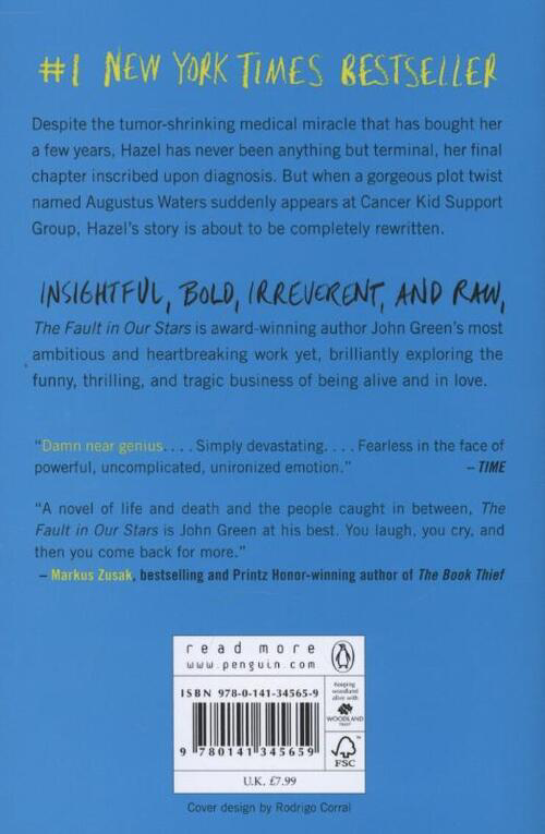 Despite the tumor-shrinking medical miracle that has bought her a few years, Hazel has never been anything but terminal, her final chapter inscribed upon diagnosis. But when a gorgeous plot twist named Augustus Waters suddenly appears at Cancer Kid Support Group, Hazel's story is about to be completely rewritten. Insightful, bold, irreverent, and raw, The Fault in Our Stars is award-winning author John Green's most ambitious and heartbreaking work yet, brilliantly exploring the funny, thrilling, and tragic business of being alive and in love. This book comes from the New York Times bestselling author of Looking for Alaska, An Abundance of Katherines, Paper Towns and - with David Levithan - Will Grayson, Will Grayson. John Green has over 1.2 million Twitter followers, and almost 700,000 subscribers to Vlogbrothers, the YouTube channel he created with his brother, Hank. The Fault in Our Stars will capture a crossover audience in the same vein as Zadie Smith, David Nicholls' One Day and Before I Die by Jenny Downham. Electric with staccato bursts of humor and tragedy. (Jodi Picoult).