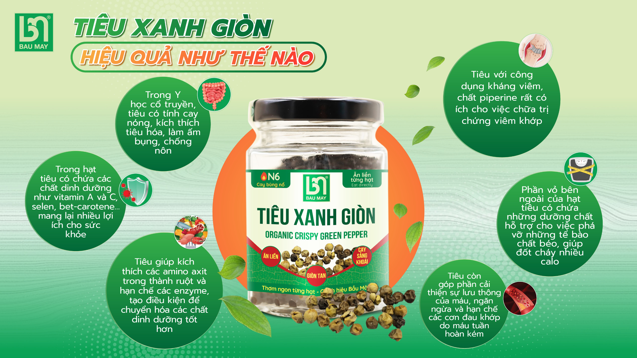 Tiêu là vua của gia vị, trong tiêu có nhiều thành phần như Vitamin, tinh dầu, piperin, chất béo, tinh bột, chanvixin, … đặc biệt piperin hạn chế oxy hóa, bảo vệ gan, hạn chế viêm, hạn chế ung thư, trầm cảm, giảm đau. Việc ăn liền từng hạt tiêu mà không cần giã, không cần rang, không cần xay, khi ăn liền cùng thức ăn giúp ăn ngon hơn, lại tốt việc ăn uống, tiêu hóa tốt, bổ sung sức đề kháng, thải độc tố, kháng khuẩn,…