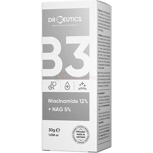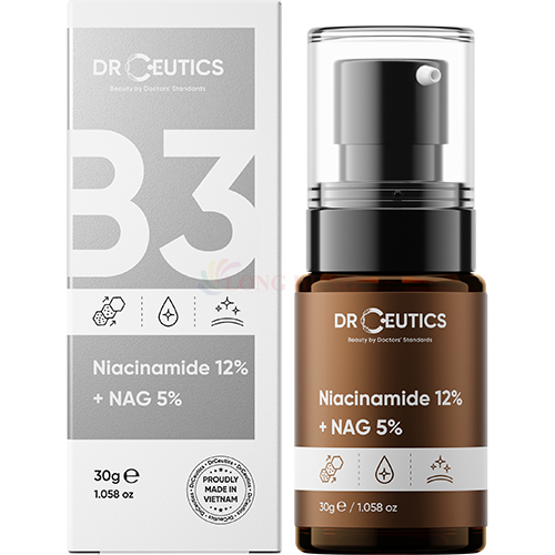 Tinh chất DrCeutics Niacinamide 12% + NAG 5% Thành phần:  Niacinamide  NAG  Rễ dâu tằm  Bưởi đắng  Cúc trường sinh  Carrot Thành phần chi tiết: Aqua, Niacinamide, Acetyl Glucosamine, Glycerin, Camellia Sinensis Leaf Extract, Butylene Glycol, Morus Alba Leaf Extra, Citrus Grandis Fruit Extract, Calendula Officinalis Flower Extract, Daucus Carota Sativa Root Extract, Arachis Hypogaea (Peanut) Seedcoat Extract, Zinc PCA, Xanthan Gum,Phenoxyethanol, Ethylhexylglycerin, Sodium Benzoate, Potassium Sorbate. Công dụng:  Chống oxy hóa, làm mờ nếp nhắn giúp làn da tươi trẻ, mịn màng  Cải thiện vết thâm, giúp da trắng sáng, đều màu.  Hỗ trợ làm giảm mụn hiệu quả  Điều chỉnh tuyến bã nhờn, thu nhỏ lỗ chân lông  Bảo vệ lớp màn cho da, tăng khả năng miễn dịch.  Ngăn ngừa và bảo vệ da khỏi tác hại của tia UV và ô nhiễm không khí. Hướng dẫn sử dụng: sau khi rửa sạch mặt và cân bằng da lấy một lượng vừa đủ thoa khắp mặt và cổ. Sử dụng 2 – 3 lần/ngày theo hướng dẫn của chuyên gia Xuất xứ: Việt Nam     LƯU Ý KHI MUA HÀNG: Cảm ơn quý khách đã quan tâm đến sản phẩm bên shop, quý khách vui lòng dành ít thời gian đọc kĩ chính sách bảo hành đổi trả:   ️Shop nhận đổi trả trong trường hợp hàng sai mẫu, size, màu do shop gửi. Bên shop chỉ giải quyết khiếu nại khi quý khách có video clip khi mở/nhận hàng. ️Bảo hành đối với sản phẩm chính hãng, quý khách trực tiếp mang sản phẩm bảo hành tới trung tâm bảo hành của hãng.   Không nhận đổi trả khi sản phẩm bị hư hại do tác động ngoại lực từ người mua như móp, bể, trầy xước, nổ điện, rớt nước, rách tem bảo hành, không đầy đủ phụ kiện và hộp. Vì lượng hàng hoá nhiều shop không nhận đổi trả trong trường hợp khách không thích, không ưng màu, chất liệu; quý khách vui lòng đọc kĩ mô tả và xem hình ảnh cụ thể; nếu cần hãy chat với shop để được tư vấn.
