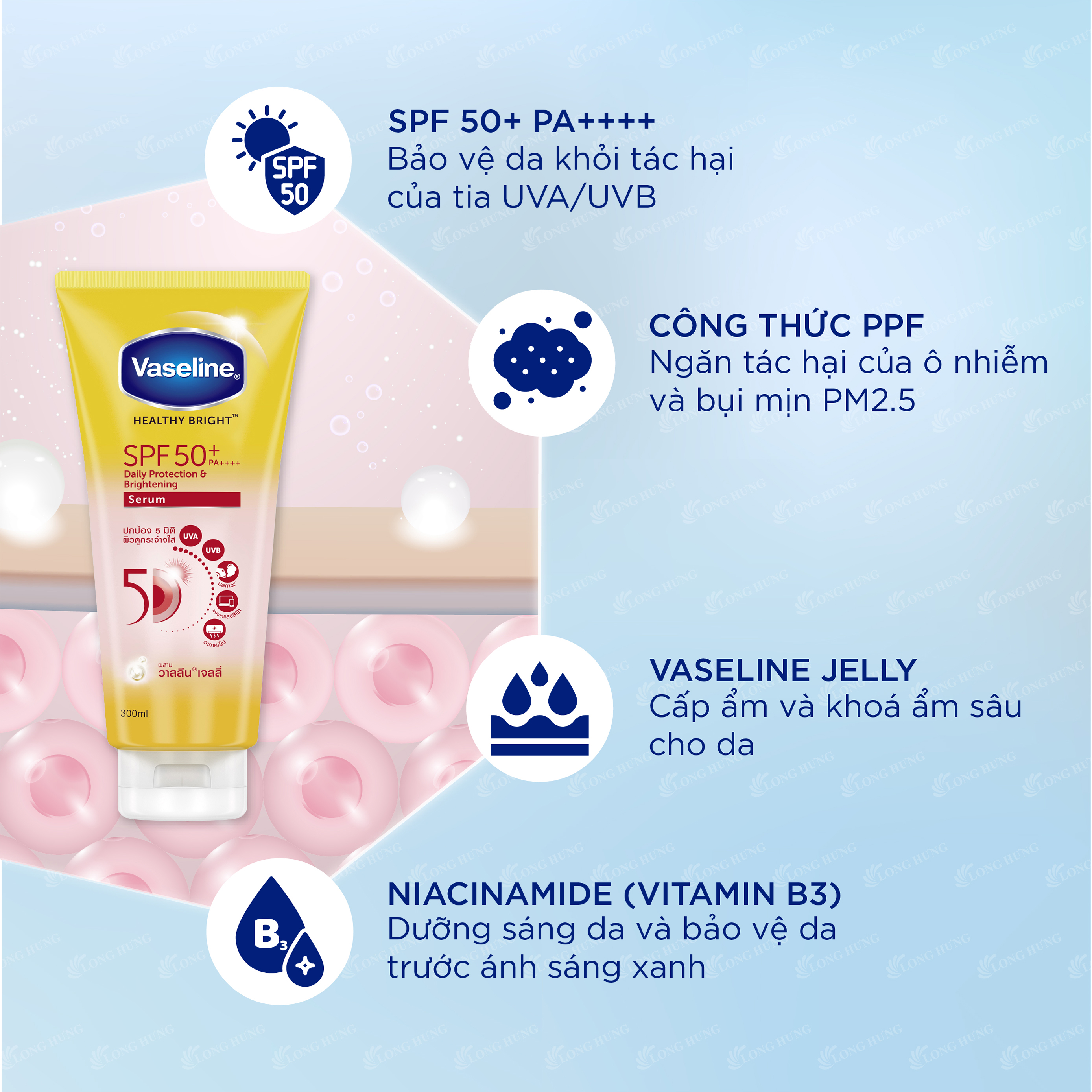 Tinh chất dưỡng thể chống nắng Vaseline Healthy Bright SPF 50+ PA++++ Thành phần: + SPF 50+ PA++++: giúp bảo vệ da chống lại tác hại của tia UVA/UVB lên đến 98%. + 10x Niacinamide