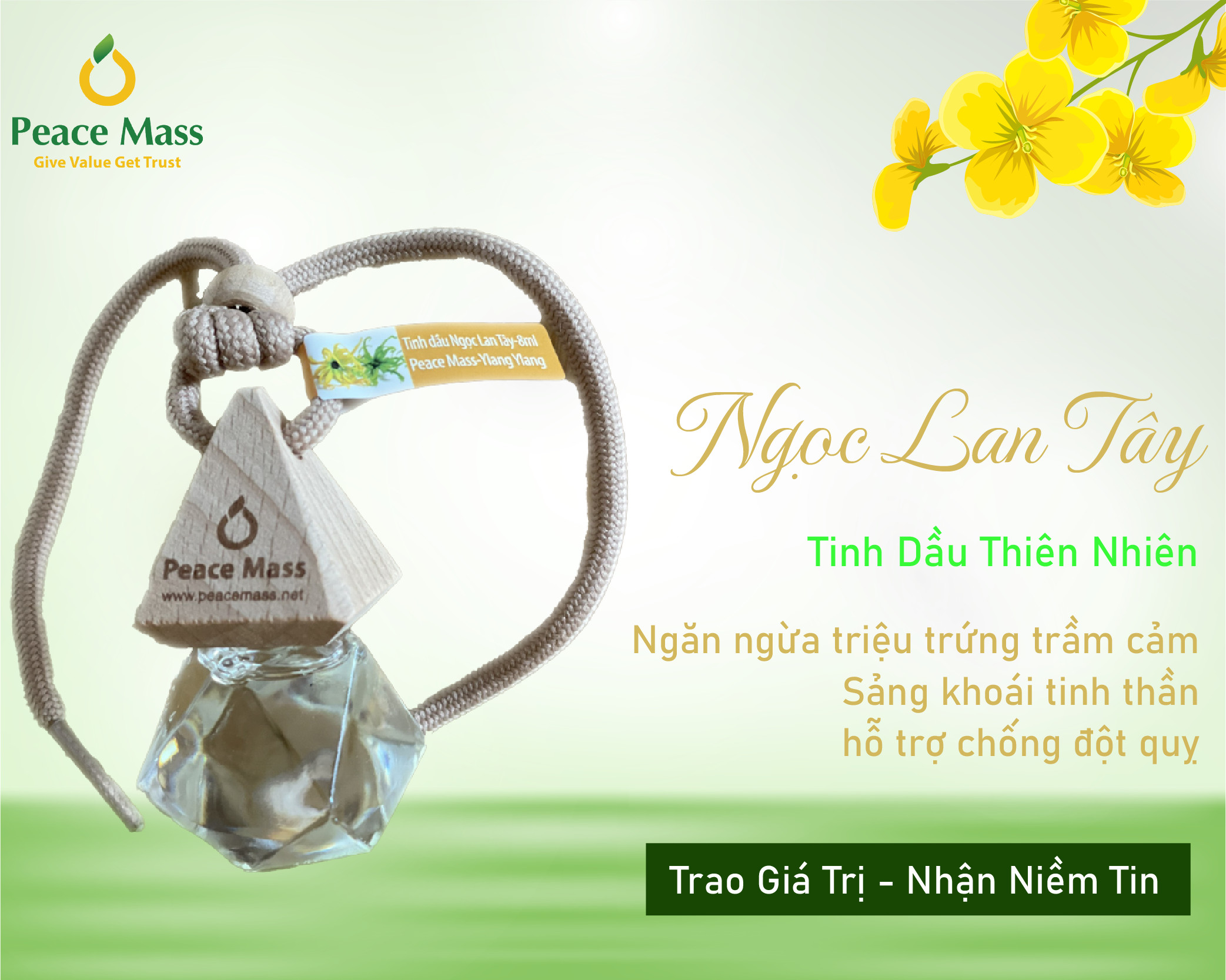 Tinh dầu Ngọc Lan Tây Peace Mass – Ylang Ylang - Nguyên liệu: nhập khẩu - Dung tích: 8ml - Vị trí sử dụng: Treo trên ô tô, trong tủ quần áo, phòng khách, phòng