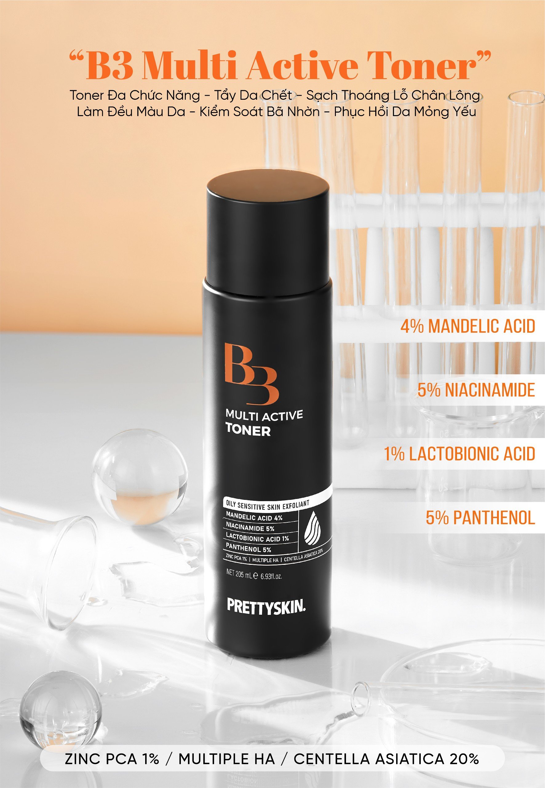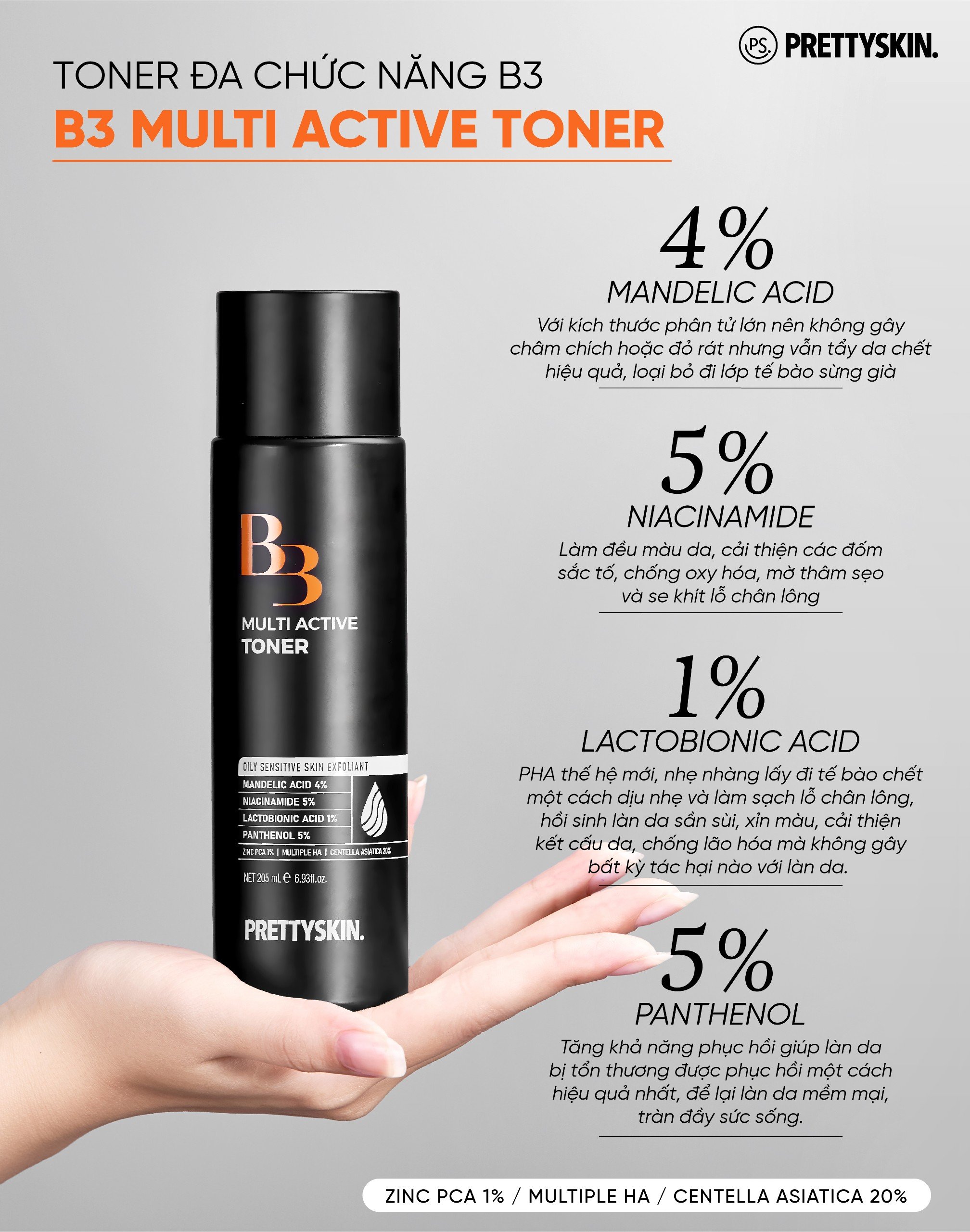 Toner đa di năng nhất hệ mặt trời - B3 Prettyskin   Tìm đâu ra 1 chiếc Toner có thể tẩy da chết một cách nhẹ nhàng lại có độ PH lý tưởng giúp cân bằng da, còn có thể kiểm soát dầu thừa, bã nhờn hiệu quả và đặc biệt chứa combo AHA-BHA-LHA loại bỏ hết cặn bẩn, bã nhờn cho da mịn màng, tươi sáng!   Mandelic Acid 4% với kích thước phân tử lớn nên không gây châm chích hoặc đỏ rát nhưng vẫn tẩy da chết hiệu quả, loại bỏ đi lớp tế bào sừng già Niacinamide 5% làm đều màu da, cải thiện các đốm sắc tố, chống oxy hóa, làm mờ thâm sẹo và se khít lỗ chân lông Lactobionic Acid 1% kích thích tăng sinh collagen, giảm sự tích tụ của melanin giúp cải thiện nếp nhăn và làm đều màu da Panthenol 5% tăng khả năng phục hồi giúp da nhanh chóng mềm mại, tràn đầy sức sống