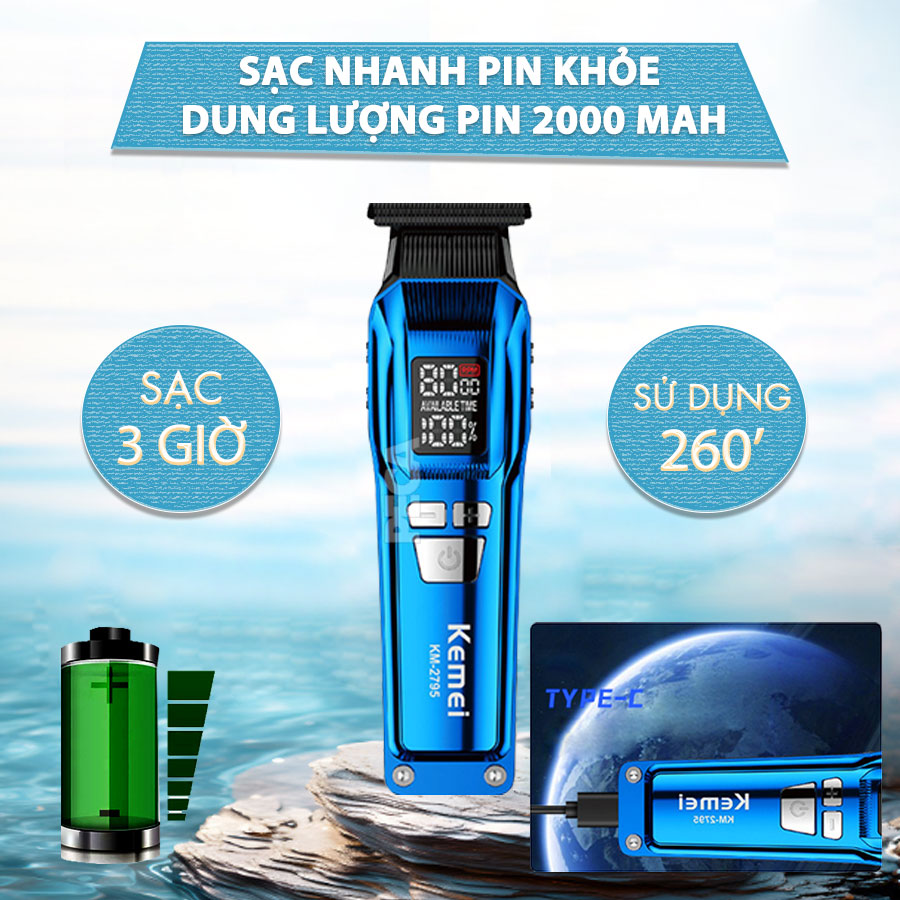 Dung lượng pin Kemei KM-2795 cực lớn lên đến 2000mAh, sạc nhanh USB type C chỉ trong 3h thời gian sử dụng lên đến 260 phút