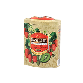 Trà đen Ceylon Basilur cao cấp vị Dâu tây & Kiwi được sản xuất từ lá trà đen Ceylon nguyên chất, quả dâu tây, kiwi, hoa cúc ngô, mứt dâu tây và kiwi; sự kết hợp giữa các loại trái cây, hương vị ngọt ngào và thơm mát của dâu tây cùng hương thơm tinh tế của Kiwi và lá trà đen Ceylon tươi mát. Kết quả mang lại một loại trà trái cây thơm ngon giúp cơ thể sảng khoái. Hương vị trái cây của dâu tây và mâm xôi mang lại cho Basilur Magic Fruits Straberry & Kiwi một hương thơm ngọt ngào và hương vị hào phóng, uống ngon cả khi ấm hoặc uống với đá.