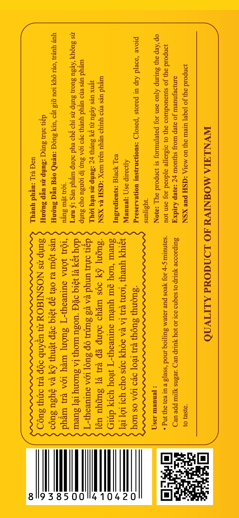 Trà đen nhãn vàng ROBINSON FARM là loại sản phẩm trà túi lọc cao cấp được chọn lọc từ những lá trà tươi nguyên, chất lượng nhất sẽ mang đến cho bạn tách trà thơm