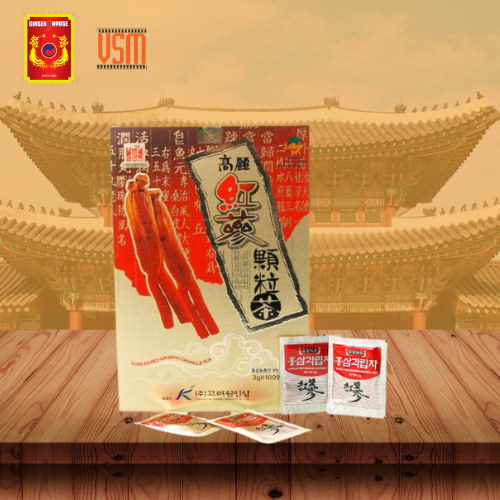 Trà Hồng Sâm Hàn Quốc Korean Red Ginseng Granule Tea Hồng sâm sẽ giúp bồi bổ sức khỏe, tăng khả năng làm việc, giúp đầu óc minh mẫn, sảng khoái, nâng cao hiệu quả làm việc và tăng cường trí nhớ. Sản phẩm dùng cho người trưởng thành, không dùng cho phụ nữ mang thai. Hồng sâm Hàn Quốc luôn được coi là "Kho báu từ phương Đông" và luôn là sản phẩm quý dùng để bồi bổ và tăng cường sức khỏe cho mọi người. Với các dưỡng chất tuyệt vời có trong hồng sâm, các sản phẩm được chiết xuất từ hồng sâm khi sử dụng đều đặn với liều lượng hợp lý sẽ giúp tăng cường sức khỏe, nâng cao sức đề kháng, giảm căng thăng, mệt mỏi, giúp tinh thần tỉnh táo, minh mẫn, hệ thống tuần hoàn được nâng cao, kích thích tiêu hóa. Bên cạnh đó, hồng sâm còn có tác dụng cân bằng nội tiết tố ở cả nam và nữ, gia tăng chất lượng cuộc sống. Từ đó, cơ thể sẽ giảm thiểu được các bệnh như huyết áp, mỡ máu, tai biến, tiểu đường, rối loạn nội tiết. Trà Hồng Sâm Korean Red Ginseng Granule Tea (Hộp 50 Gói x 3g) được sản xuất từ tinh chất hồng