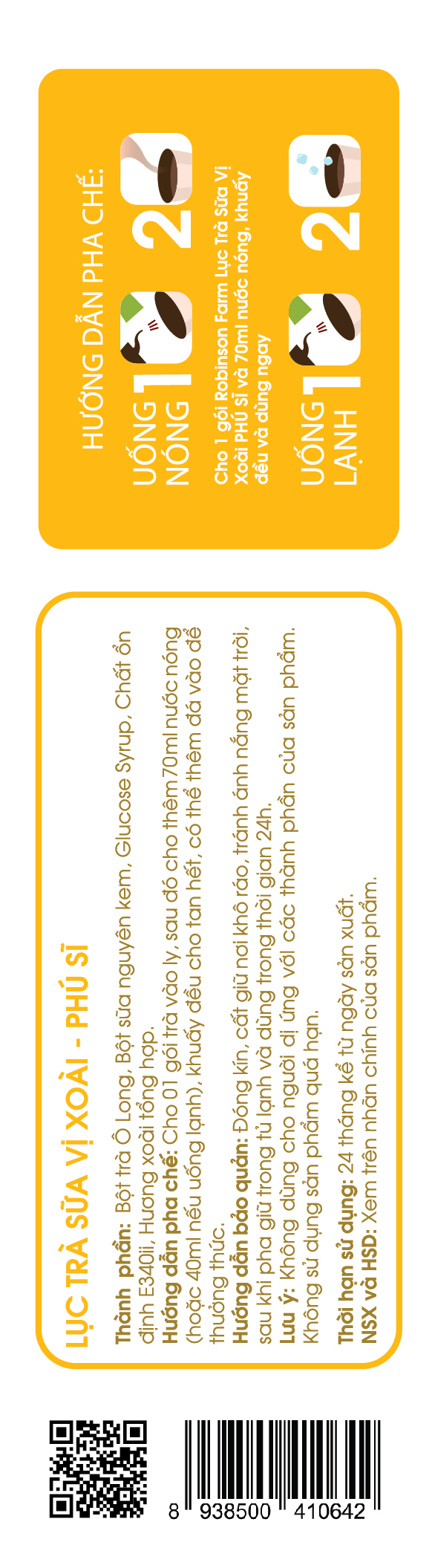 Mua tại TiktokTHÔNG TIN SẢN PHẨM Định lượng : 90g ( 5 gói * 18g ) Thương hiệu: ROBINSON FARM Xuất xứ: Việt Nam Nơi sản xuất: Công ty TNHH Rainbow Việt Nam Trà sữa Phú Sỹ - Lục Trà Sữa Vị Xoài mang đến trải nghiệm tuyệt vời với sự kết hợp hoàn hảo giữa ba hương vị đặc trưng: Béo vị sữa, thơm vị xoài và đậm vị trà. Sản phẩm được chế biến từ nguồn nguyên liệu tươi ngon, với những trái xoài chín mọng và trà xanh Nhật Bản thượng hạng, cùng công nghệ sản xuất hiện đại giúp giữ trọn hương vị tự nhiên. Mỗi ngụm trà sữa Phú Sỹ là sự hòa quyện hoàn hảo giữa độ béo ngậy của sữa, hương xoài tươi mát và trà đậm đà, tạo nên một thức uống vừa ngon miệng vừa dễ chịu.