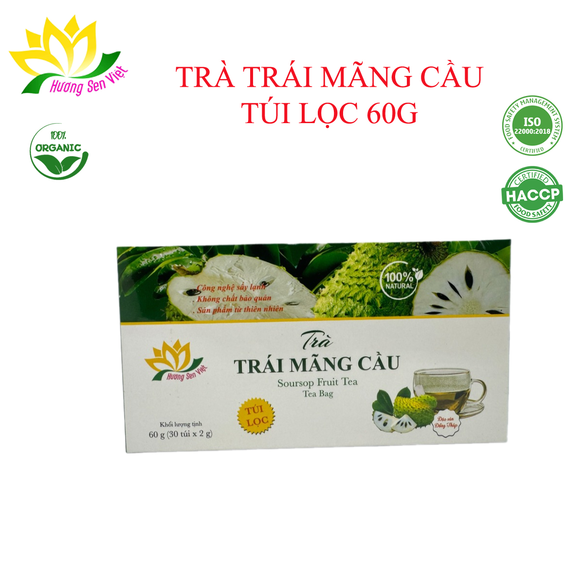 Thành phần: Trái mãng cầu xiêm 100% Trà Trái mãng cầu túi lọc được sản xuất 100% từ trái mãng cầu xiêm, không phẩm màu, hoá chất với công nghệ sấy nhiệt lạnh đảm bảo giữ được các dược tính, hương vị thơm, thanh dịu, một chút vị ngọt hậu dễ uống, tạo cảm giác sảng khoái khi sử dụng nên rất được ưa chuộng. Công dụng: Giảm căng thẳng stress, giúp ngủ ngon giấc, tốt cho tim mạch, điều hòa huyết áp, thanh nhiệt giải độc, hỗ trợ tiêu hóa, bổ sung dinh dưỡng cho cơ thể. Cách dùng: Cho 1 túi trà vào 200 ml nước sôi, để 3-5 phút là dùng được. Có thể thêm đường, đá lạnh hoặc dùng nóng, thích hợp cho nhiều đối tượng, từ giới trẻ đến người lớn tuổi, người già. Hướng dẫn bảo quản: Nơi khô ráo, thoáng mát và tránh ánh nắng chiếu trực tiếp Hướng dẫn sử dụng: Cho 1 túi lọc Trà Trái mãng cầu vào 300ml – 400ml  nước sôi, chờ từ 3 - 5 phút là có thể dùng được. Thời hạn sử dụng sản phẩm: 24 tháng kể từ ngày sản xuất