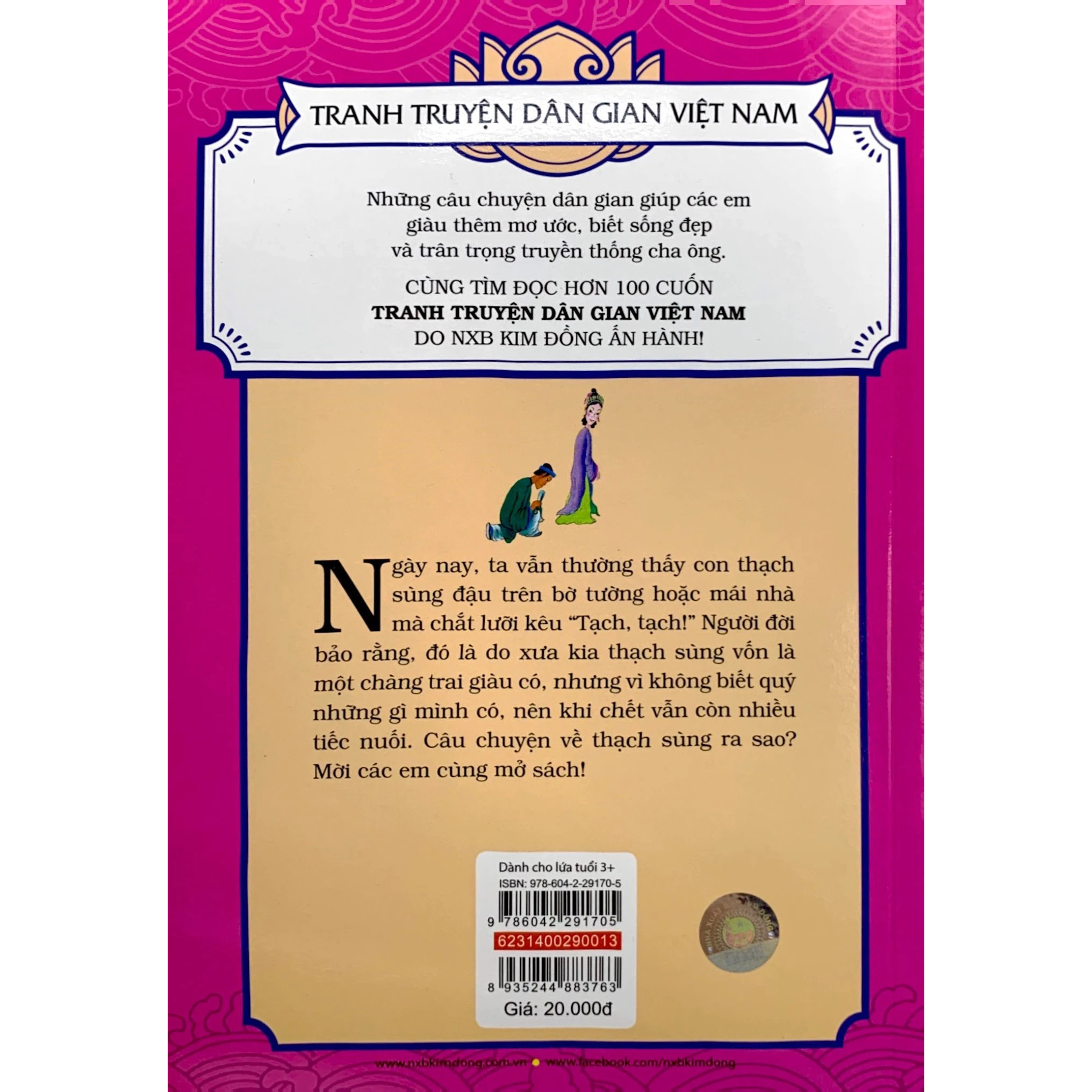 Mua tại TiktokGiới thiệu sách Những câu chuyện dân gian giúp các em giàu thêm mơ ước, biết sống đẹp và trân trọng truyền thống cha ông. Tóm tắt nội dung Ngày nay, ta vẫn thường thấy con thạch sùng đậu trên bờ tường hoặc mái nhà mà chắt lưỡi kêu “Tạch, tạch!” Người đời bảo rằng, đó là do xưa kia thạch sùng vốn là một chàng trai giàu có, nhưng vì không biết qúy những gì mình có, nên khi chết vẫn còn nhiều tiếc nuối. Câu chuyện về thạch sùng ra sao? Mời các em cùng mở sách!