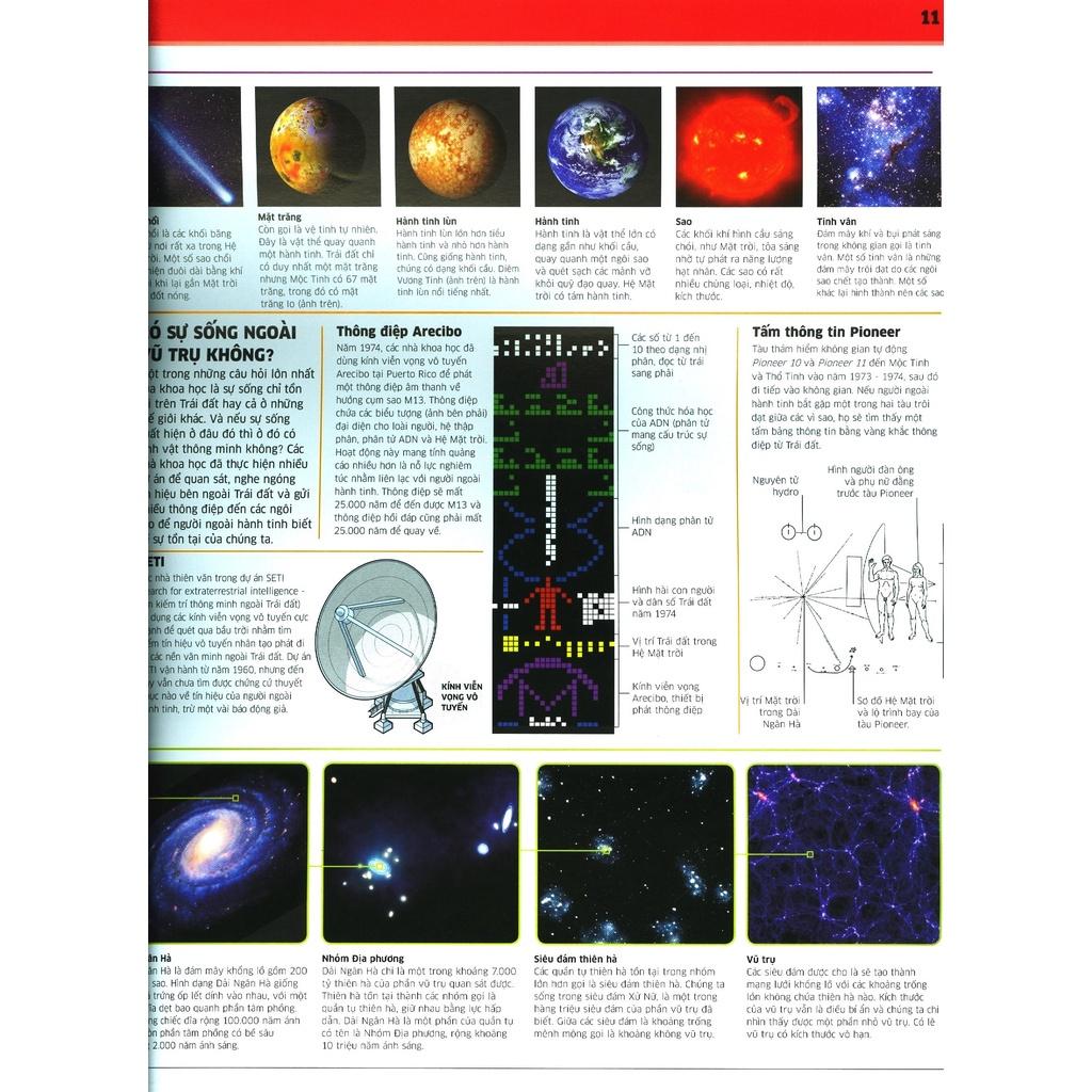 Mua tại TiktokTri Thức Về Vạn Vật - Một Thế Giới Trực Quan Chưa Từng Thấy Cuốn sách gồm 6 chương sẽ mang đến cho bạn đọc những trải nghiệm thú vị bao gồm: KHÔNG GIAN – KHÁM PHÁ KHÔNG GIAN VŨ TRỤ BAO LA Du hành và khám phá bí ẩn của vũ trụ từ vụ nổ BigBang tới sự hình thành của các thiên hà, từ sự ra đời đến cái chết của một ngôi sao như thế nào, cùng tìm hiểu hệ mặt trời và các hoạt động nghiên cứu thiên văn khác. Cuốn sách mang đến kiến thức nền tảng và trải nghiệm chân thực như một nhà du hành qua những hình ảnh đồ họa sắc nét, chú thích rõ ràng cụ thể. TRÁI ĐẤT – KHÁM PHÁ NHỮNG TRI THỨC VỀ TRÁI ĐẤT TỪ TẬN LÕI SÂU Cùng bạn rong ruổi cùng trời cuối đất, khám phá hành tinh xanh từ cấu trúc lõi trái đất gồm những tầng nào đến các mảng kiến tạo trên bề mặt địa c.ầu, hiểu về các hiện tượng tự nhiên như Bão, núi lửa phun trào, động đất đến giải đáp các bí ẩn đại dương… TỰ NHIÊN – TRẢI NGHIỆM NHƯ NHỮNG NHÀ TỰ NHIÊN HỌC Giải đáp câu hỏi quá trình tiến hóa của các giống loài từ 3,8 tỷ năm trước cho đến hiện tại. Tìm hiểu sự sống khắp hành tinh, từ những đỉnh núi cao nhất đến vực thẳm sâu nhất dưới lòng đại dương. CƠ THỂ NGƯỜI – TRẢI NGHIỆM NHƯ NHÀ GIẢI PHẪU HỌC Cơ thể người là một cỗ máy phức tạp kỳ diệu, được hình thành từ hàng triệu phần khác nhau. Cuốn sách sẽ giúp bạn tìm hiểu từ cấu trúc của một tế bào nhỏ bé đến cơ thể người bình thường, qua đó hiểu được cách thức hoạt động, cấu tạo cơ thể. KHOA HỌC – TRẢI NGHIỆM NHƯ NHÀ KHOA HỌC Cuốn sách giải thích những quy luật ngầm – nguyên lý hoạt động chi phối sự vận hành của vạn vật, từ nguyên tử và ánh sáng cho tới lực hấp dẫn và từ trường. Nhờ đó khơi nguồn cảm hứng của chúng ta để tạo ra nhiều loại máy móc và công nghệ ngày càng hiện đại hơn. LỊCH SỬ - KHÁM PHÁ NHƯ NHÀ SỬ HỌC Cuốn sách tái hiện những câu chuyện lịch sử của nhân loại, từ cuộc chiến tranh cổ đại đến những tai họa kinh khủng dẫn tới dân tộc diệt vong. Cuốn sách cũng nghiên cứu các thành tựu tiến bộ của loài người về văn hóa – công nghệ từ thời đồ đá đến hiện nay.