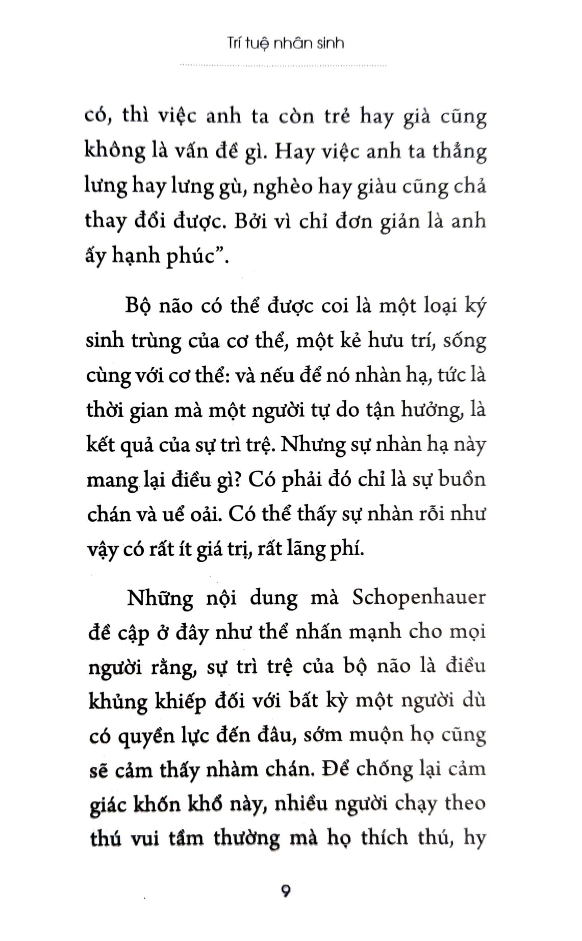Mua tại TiktokTrí Tuệ Nhân Sinh GIỚI THIỆU TÁC GIẢ: Arthur Schopenhauer, một trong những triết gia vĩ đại của nước Đức, nổi tiếng với những quan điểm đầy sáng tạo và phản biện sâu sắc về cuộc sống và nhân sinh. Ông được biết đến với việc khuyến khích một lối sống đơn giản, khổ hạnh và chay tịnh, mặc dù trong cuộc sống cá nhân ông lại thích ăn thịt, uống rượu vang và mê mẩn phụ nữ. Schopenhauer đã mở rộng và phát triển triết lý Kant về cách con người trải nghiệm thế giới, đặc biệt là trong việc khám phá sâu sắc về bản chất của khổ đau và sự vô ích trong cuộc sống. Triết gia này không chỉ nổi tiếng với sự độc lập tư tưởng mà còn với sự dám nghĩ, dám nói và sự sâu sắc về tâm lý con người, tạo nên dấu ấn sâu sắc trong lịch sử triết học thế giới. GIỚI THIỆU TÁC PHẨM: TRÍ TUỆ NHÂN SINH – CUỘC DẠO CHƠI CỦA MỘT “ĐỘC CÔ” GIỮA CUỘC ĐỜI. Trí Tuệ Nhân Sinh của Arthur Schopenhauer là một tác phẩm triết học sâu sắc về hạnh phúc và ý nghĩa cuộc sống. Trong cuốn sách này, Schopenhauer đề cập nhiều điều thú vị mà bạn đọc có thể chiêm nghiệm và tự rút ra cho mình những bài học quý giá. Ông cho rằng, những gì một người có ở bản thân mình, cùng với mục tiêu cuộc sống của anh ta, là yếu tố trực tiếp dẫn đến hạnh phúc và phúc lợi của người đó. Tất cả những thứ khác chỉ là trung gian và gián tiếp và ít bị ảnh hưởng. Schopenhauer lập luận, con người có thể dễ dàng chịu đựng một điều bất hạnh đến từ bên ngoài dễ dàng hơn là điều bất hạnh từ bên trong. Vận mệnh có thể thay đổi, nhưng tính cách thì không. Vì vậy, những phước lành từ chủ quan, một bản chất cao thượng, một cái đầu có năng lực, một tính khí vui vẻ, tinh thần trong sáng, một thể chất khỏe mạnh, là những yếu tố đầu tiên và quan trọng nhất của hạnh phúc. “Đừng nên kỳ vọng nhiều vào người khác, hay nói chung là đừng nên kỳ vọng từ thế giới bên ngoài” – như một châm ngôn đúng với bất kỳ ai! Chính bản thân mình là nguồn gốc của những điều tốt đẹp nhất mà con người có thể đạt được. Càng đúng hơn khi khẳng định – một người càng vui vẻ hạnh phúc hơn khi tìm thấy nguồn vui trong chính mình.