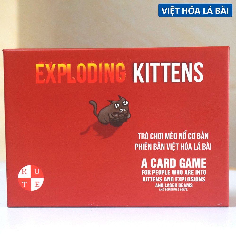 • Số người chơi: 2-5 người (nếu có bản mở rộng có thể chơi đến 9 người) CÁCH CHƠI: Bạn sẽ có một bộ bài có chứa một số lá Exploding Kittens. Cách chơi là bạn sử dụng những lá bài đặt xuống mặt bàn và thay phiên rút những lá bài trên chồng bài rút cho đến khi một người nào đó rút phải lá Exploding Kitten. Khi đó, người rút phải lá bài đó sẽ bị nổ. Họ bị chết ngay và rời khỏi game. Trò chơi tiếp tục cho đến khi chỉ còn lại một người, và người đó là người chiến thắng. SET UP ( top boardgame)