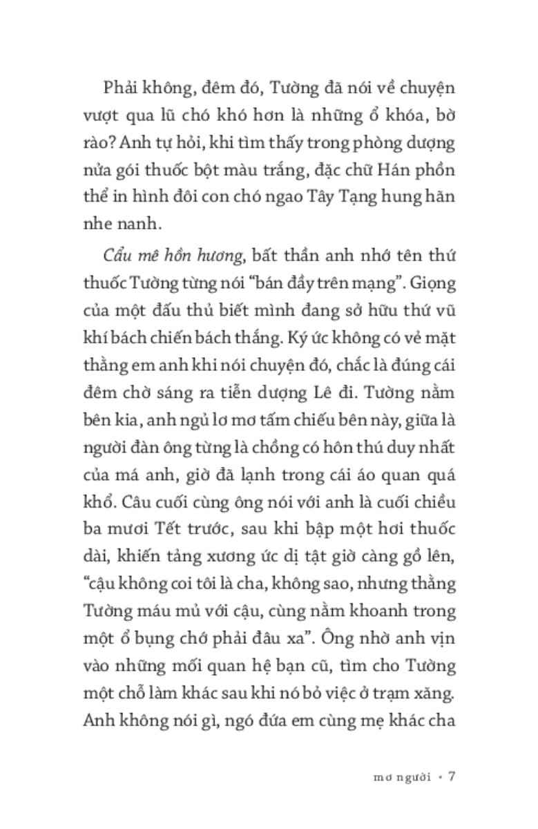 “Em thà trôi một mình. Nhưng những gì còn sót lại của một cù lao phân rã chẳng là bao. Vài ba mái nhà lấp ló trên mặt nước, một vài cái , những rẻo đất đủ rộng cho một người ngồi thì cũng có, lại trôi đờ đẫn đằng xa. Mãi mới có mảnh đất trôi gần, đúng lúc nó rùng mình nứt làm hai.