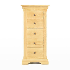 Chất liệu chính: Gỗ sồi/ Veneer; Màu sắc: Màu tự nhiên; Thời hạn bảo hành: 24 tháng; Thời gian giao hàng: 7-10 ngày; Phòng chính: Phòng ngủ; Phòng khác: Phòng làm việc; Yêu cầu lắp đặt: Không; Bộ sưu tập: Bộ Victoria; Tình trạng tồn kho: Đặt đóng; Phong cách: Classic; Hoàn thiện: Sơn PU; Kích thước (mm): 550x 400 x 1180; Chức năng: Tủ ngăn kéo; Loại sản phẩm: Tủ; Xuất xứ: Việt Nam; Đơn vị tính: Cái; Kiểu dáng: 5 ngăn;