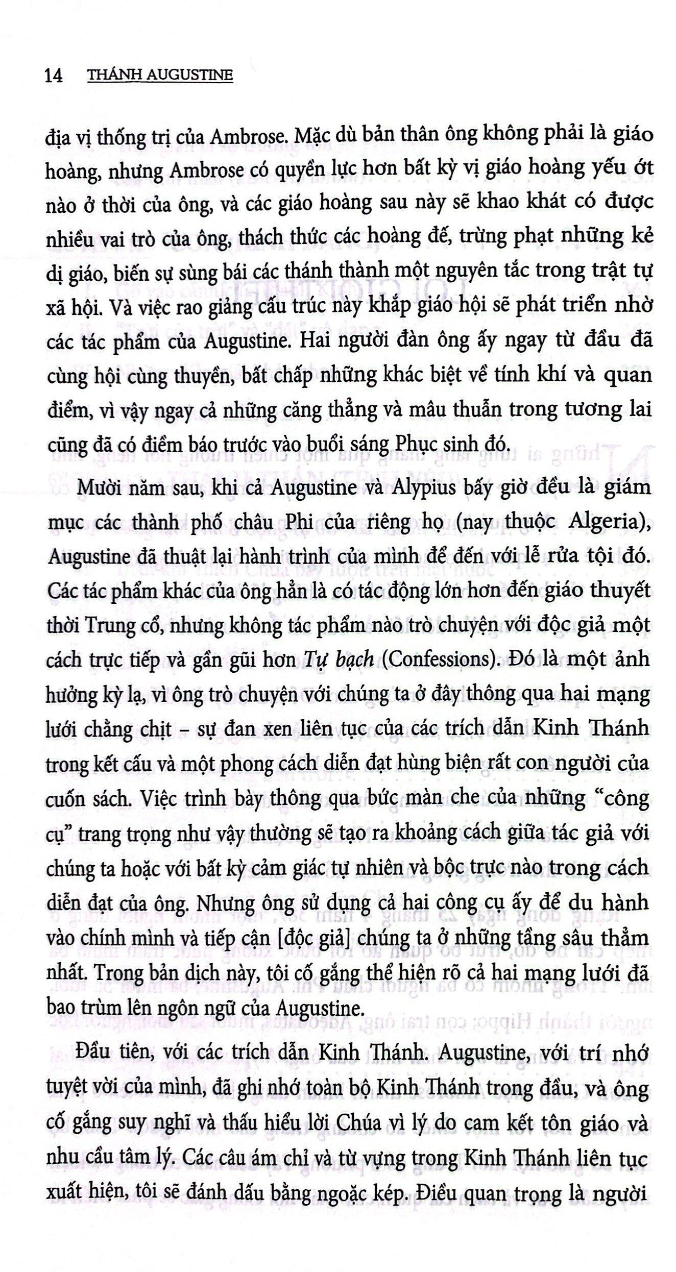 Với Tự bạch (Confessions), dưới nghi thức thú tội quen thuộc thường gặp ở các tín đồ Kitô giáo hóa ra ẩn chứa một cuộc trò chuyện thú vị và sâu sắc giữa Thánh Augustine và Thiên Chúa. Không chỉ là chiêm nghiệm lại cuộc đời và kiểm điểm những lỗi lầm của cá nhân Augustine từ thuở bé (còn vô tri) cho đến khi lớn dần lên thành một con người có ý thức và biết tư duy, luận lý để dùng khả năng đó nhằm bào chữa cho tội lỗi của m.ình, mà cuộc trò chuyện này còn gửi gắm những tìm sâu của Augustine về các tầng nghĩa sâu sắc đối với những gì ông nghiệm ra từ Kinh Thánh, về ký ức (và cơ chế ghi nhớ của con người), về thời gian, về con người, về tình yêu (thánh thần) ở dạng 3D và cả ở ngoài thế giới 3D.