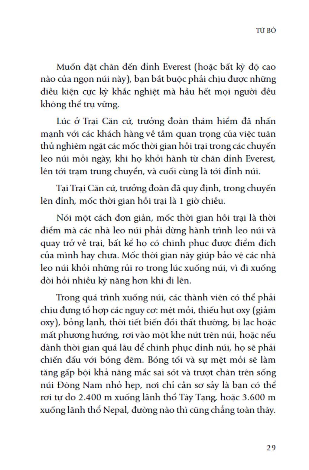Xuyên suốt mười một chương sách, Annie Duke đ.ã sử dụng những bằng chứng khoa học, những trường hợp điển hình và những phân tích thấu đáo để chỉ ra những sự thật về quyết định từ bỏ. Trong khi kiên trì là một phẩm chất không thể thiếu để đạt đến thành công, thì mặt trái của nó là có thể khiến chúng ta sa lầy vào những nỗ lực không còn xứng đáng. Không ít cá nhân có tên tuổi đã phạm phải sai lầm này và đánh mất cả danh tiếng lẫn cơ hội phát triển. Nhiều doanh nghiệp lớn như Sears, Blockbuster hay chuỗi cửa hàng giảm giá ABC đã tiêu tốn hàng triệu đô-la cố duy trì một mô hình hoặc quy trình đã không còn hoạt động hiệu quả, rốt cuộc dẫn tới kết quả vô cùng đáng tiếc. Chúng ta có tâm lý muốn tiếp tục dồn sức cho một nỗ lực m.ình đã đầu tư quá nhiều mà không nhận ra rằng khi kiên trì với một nỗ lực không còn xứng đáng là ta đang lãng phí thời gian, tiền bạc và năng lượng – những thứ mà lẽ ra ta có thể sử dụng cho một mục tiêu tốt hơn.