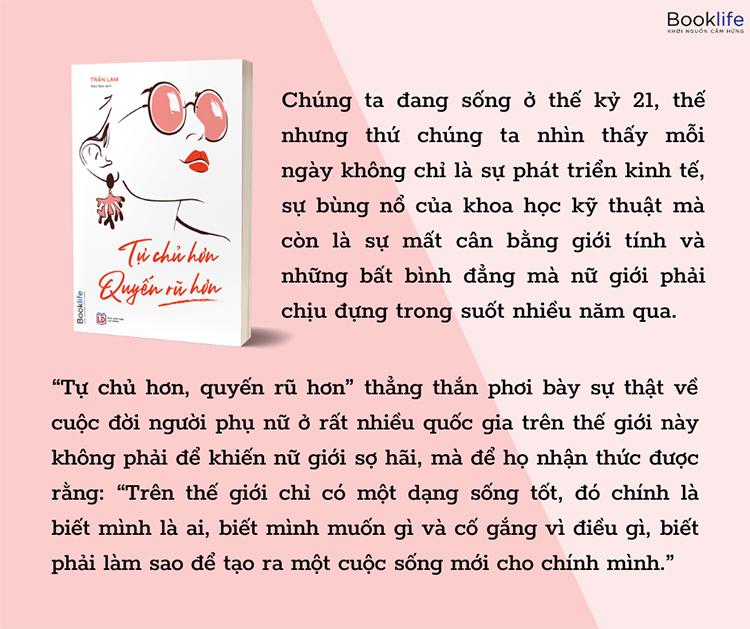 Mua tại TiktokTự Chủ Hơn Quyến Rũ Hơn Chúng ta đang sống ở thế kỷ 21, thế nhưng thứ chúng ta nhìn thấy mỗi ngày không chỉ là sự phát triển kinh tế, sự bùng nổ của khoa học kỹ thuật mà còn là sự mất cân bằng giới tính và những bất bình đẳng mà nữ giới phải chịu đựng trong suốt nhiều năm qua. Xã hội tuy hiện đại, cởi mở nhưng vẫn luôn tồn tại những mối nguy hiểm, rủi ro đối với nữ giới. Ngay từ khi còn là một đứa trẻ sơ sinh, xã hội đã mang đến rất nhiều trở ngại đối với phái nữ. Quan niệm trọng nam khinh nữ, những khó khăn trên con đường học vấn, những quấy nhiễu và coi thường trên con đường công danh, quyền lợi bất bình đẳng trong quan hệ hôn nhân gia đình… Truyền thống văn hóa, hủ tục lạc hậu vẫn còn tồn tại ở rất nhiều nơi khiến cho cuộc đời của mỗi người phụ nữ luôn đầy ắp những thách thức và chông gai, nếu như không can đảm đối diện và học cách tự chủ, nữ giới sẽ không thể nào có được tự do thực sự và được toàn quyền quyết định cuộc sống của chính mình. Chỉ khi được nhận thức, được cởi bỏ thì phụ nữ mới có thể đón nhận bình đẳng và tự do thực sự. Trực tiếp đối diện với thế giới mới có thể đối diện với bản thân. Đây cũng là một bước quan trọng trong quá trình phát triển bản thân. Trần Lan đã dùng ngòi bút sắc bén của mình để bắt lấy chân tướng của cuộc đời ẩn giấu dưới lớp mặt nạ giả dối và kêu gọi mọi người dũng cảm đối mặt. “Tự chủ hơn, quyến rũ hơn” thẳng thắn phơi bày sự thật về cuộc đời người phụ nữ ở rất nhiều quốc gia trên thế giới này không phải để khiến nữ giới sợ hãi, mà để họ nhận thức được rằng: “Trên thế giới chỉ có một dạng sống tốt, đó chính là biết mình là ai, biết mình muốn gì và cố gắng vì điều gì, biết phải làm sao để tạo ra một cuộc sống mới cho chính mình.” Thông tin tác giả: Trần Lam, biên kịch, biên tập viên truyền hình, người sáng lập “Ngôi nhà nhỏ hy vọng” - một tổ chức hỗ trợ, giúp đỡ trẻ em mồ côi, trẻ em có hoàn cảnh khó khăn, trẻ em lang thang cơ nhỡ và bị bạo hành ở khắp các vùng quê Trung Quốc. Bà là tác giả của nhiều tác phẩm nổi tiếng được công chúng Trung Quốc đón nhận. Khác với rất nhiều tác phẩm mang danh nữ giới khác trên thị trường, Tự chủ hơn, quyến rũ hơn của Trần Lan “nói ít hiểu nhiều”, đặt mình vào hoàn cảnh của người khác, xem xét trên góc độ của nữ giới nói chung, bắt mạch cho cuộc đời của phụ nữ, nói sâu và rõ về căn nguyên và cách thức ảnh hưởng đến số phận của phụ nữ, đồng thời đưa ra những phương pháp hướng dẫn thực tế và có thể thực hiện được. Cô có thể khiến người đọc hiểu sâu biết rộng về số phận của phụ nữ, đồng thời dựa trên giới tính và đặc điểm của bản thân để tiến hành nhận thức vị trí của chính mình, hướng dẫn bản thân sống một cuộc sống phù hợp với ý muốn của mình hơn, hay nói cách khác là “có được một cuộc đời do chính mình làm chủ”. Trần Lan không chỉ đơn thuần kể về nữ quyền nên làm thế nào để đánh bại nam quyền, cô đứng trên lập trường của nữ giới, nhìn từ góc độ và quyền lợi của nữ giới, lấy trục thời gian là một đời của phụ nữ để thủ thỉ với bạn cách đối phó với những vấn đề có thể sẽ gặp phải trong cuộc đời của một người phụ nữ. Nội dung sâu sắc, lời lẽ đơn giản, dễ hiểu, người đọc sẽ có cảm giác như chính mình được trải nghiệm và tỉnh ngộ. Một số trích dẫn hay: “Những vì sao rải khắp bầu trời là những cơ hội mới, nhưng cũng là đôi mắt mà con người trong tương lai đang nhìn.” Phụ nữ nên có quyền được tự do tránh xa nỗi sợ hãi, tự do hưởng nền giáo dục, tự do theo đuổi hạnh phúc, tự do lên án sự lợi dụng và bóc lột. Phụ nữ nên hưởng những quyền lợi của một con người chứ không phải là trở thành một món đồ bị vắt kiệt, bị bóc lột. _ Trên thế giới chỉ có một dạng sống tốt, đó chính là bạn biết mình là ai, biết mình muốn gì và cố gắng vì điều gì, biết phải làm sao để tạo ra một cuộc sống mới cho chính mình.