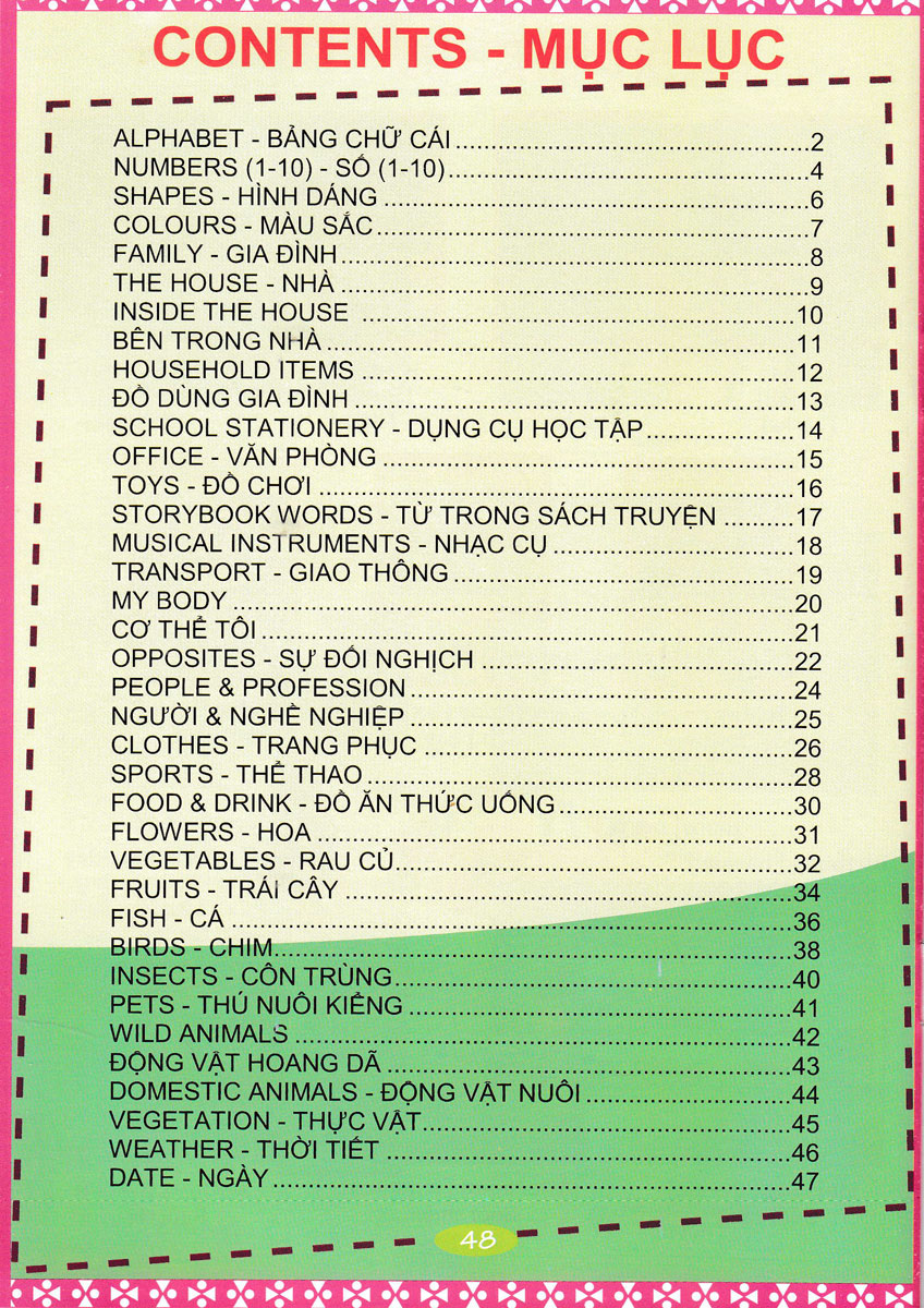 Từ Điển Anh Việt Bằng Hình Ảnh gồm các nội dung: Alphabet - Bảng chữ cái Numbers (1-10) - Số (1-10) Colours - Màu sắc Family - Gia đình The house - Nhà Inside the house - Bên trong nhà Househole items - Đồ dùng gia đình School stationery - Dụng cụ học tập Office - Văn phòng Toys - Đồ chơi Storybook words - Từ trong sách truyện Musical instruments - Nhạc cụ Transport - Giao thông My body - Cơ thể Opposites - Sự đối nghịch People & Profession - Người & Nghề nghiệp Clothes - Trang phục Sports - Thể thao Food & Drink - Đồ ăn thức uống Flowers - Hoa Vegetables - Rau củ Fruits - Trái cây Fish - Cá Birds - Chim Insects - Côn trùng Pets - Thú nuôi kiểng Wild animals - Động vật hoang dã Domestic animals - Động vật nuôi Vegetation - Thực vật Weather - Thời tiết Date - Ngày