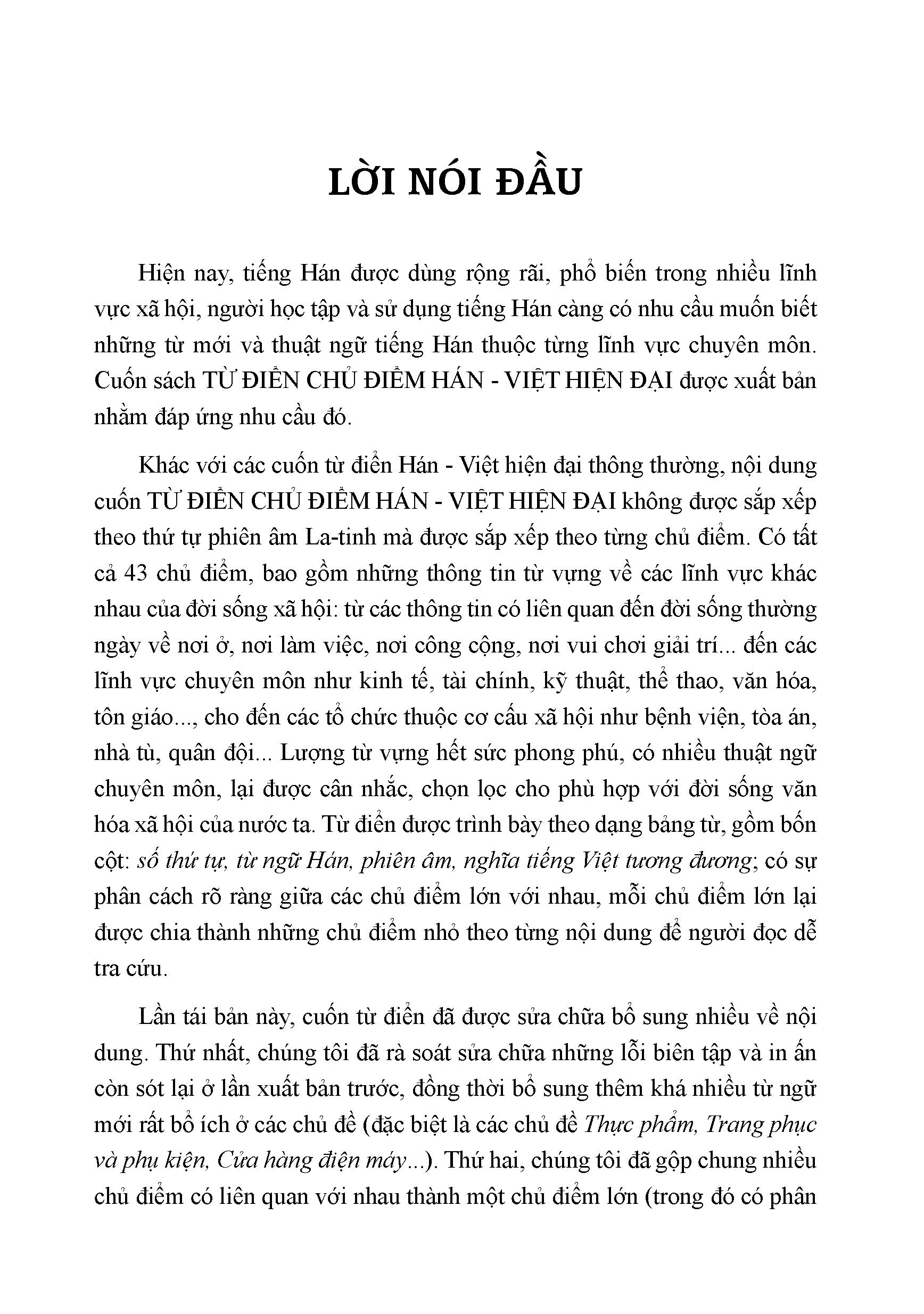 Hiện nay, tiếng Hán được dùng rộng rãi, phổ biến trong nhiều lĩnh vực xã hội, người học tập và sử dụng tiếng Hán càng có nhu cầu muốn biết những từ mới và thuật ngữ tiếng Hán thuộc từng lĩnh vực chuyên môn. Cuốn sách TỪ ĐIỂN CHỦ ĐIỂM HÁN - VIỆT HIỆN ĐẠI được xuất bản nhằm đáp ứng nhu cầu đó.