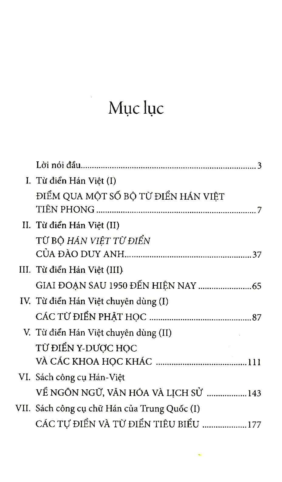 Sách sẽ điểm qua hầu như tất cả những bộ tự điển – từ điển Hán Việt đã xuất hiện ở Việt Nam từ khởi thủy cho đến hiện tại, khởi đầu từ những công trình tiên phong có trước cả hai bộ Hán Việt từ điển của Đào Duy Anh (1932) và Hán Việt tự điển của Thiền Chửu (1942); rồi lần lượt giới thiệu sơ lược theo thứ tự thời gian xuất hiện sau đó hầu hết những bộ tự điển – từ điển Hán Việt tiêu biểu đã ghi nhận được, kể từ bộ Từ điển Trung Việt của Văn Tân trở đi.