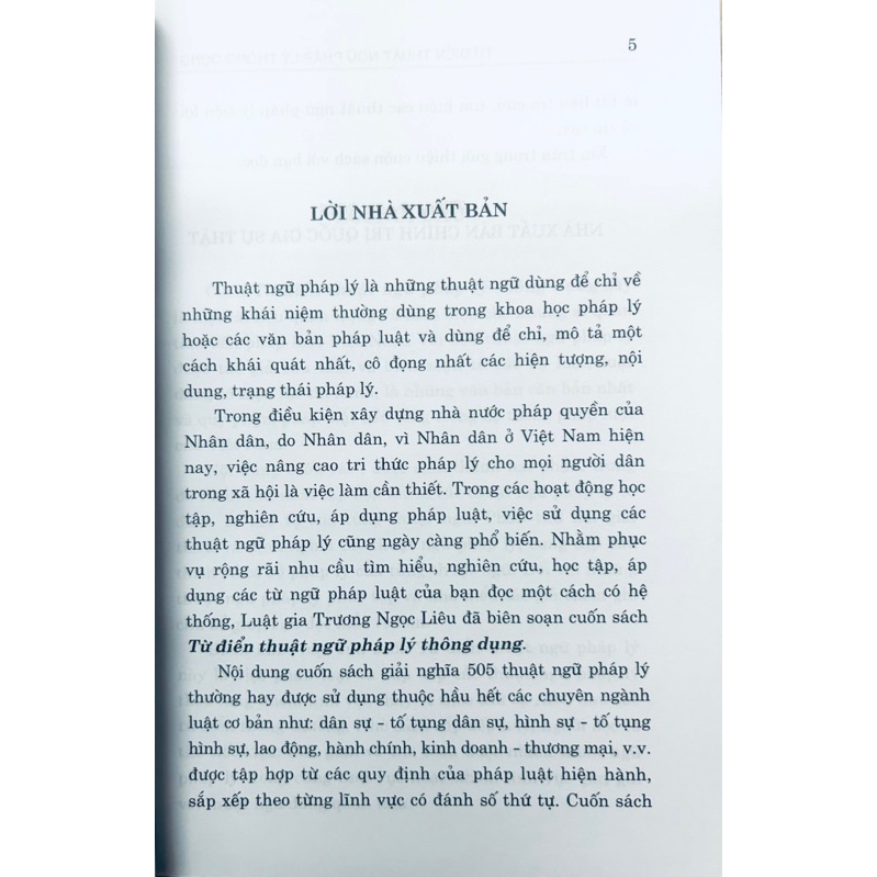 Từ Điển Thuật Ngữ Pháp Lý Thông Dụng Tác giả: Luật gia Trương Ngọc Liêu Nhà xuất bản: Chính Trị Quốc Gia Sự Thật Khổ sách: 14.5*20.5cm Phát hành: 10.2023 Công ty phát hành: Nhà xuất bản Chính Trị Quốc Gia Sự Thật Giá bìa: 57.000 đ  Số trang:144 trang  Hình thức bìa: Bìa mềm Lời giới thiệu:  Thuật ngữ pháp lý là những thuật ngữ dùng để chỉ về những khái niệm thường dùng trong khoa học pháp lý hoặc các văn bán pháp luật và dùng để chỉ, mô tả một cách khái quát nhất, cô đọng nhất các hiện tượng, nội dung, trạng thái pháp lý. Trong điều kiện xây dựng nhà nước pháp quyền của Nhân dân, do Nhân dân, vì Nhân dân ở Việt Nam hiện nay, việc nâng cao tri thức pháp lý cho mọi người dân trong xã hội là việc làm cần thiết. Trong các hoạt động học tập, nghiên cứu, áp dụng pháp luật, việc sử dụng các thuật ngữ pháp lý cũng ngày càng phổ biến. Nhằm phục vụ rộng rãi nhu cầu tìm hiểu, nghiên cứu, học tập, áp dụng các từ ngữ pháp luật của bạn đọc một cách có hệ thống, Luật gia Trương Ngọc Liêu đã biên soạn cuốn sách: Từ điển thuật ngữ pháp lý thông dụng. Nội dung cuốn sách giải nghĩa 505 thuật ngữ pháp lý thường hay được sử dụng thuộc hầu hết các chuyên ngành luật cơ bản như: dân sự - tố tụng dân sự, hình sự - tố tụng hình sư, lao động, hành chính, kinh doanh - thương mại,  được tập hợp từ các quy định của pháp luật hiện hành, sắp xếp theo từng lĩnh vực có đánh số thứ tự.